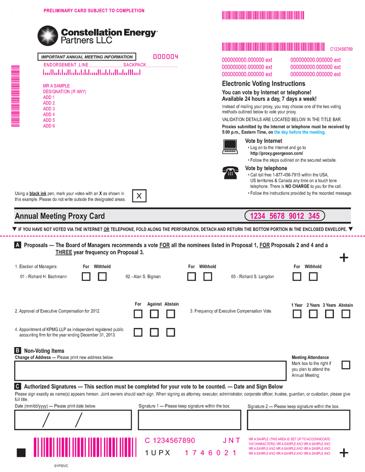 Proxy - Constellation Energy Partners LLC The undersigned hereby appoints Stephen R. Brunner and Charles C. Ward, or each of them, with or without the other, proxies, with full power of substitution and re-substitution, to vote all common units that the undersigned is entitled to vote at the 2013 Annual Meeting of Unitholders of Constellation Energy Partners LLC to be held on December 5, 2013, and all adjournments and postponements thereof on all matters that may properly come before the annual meeting. Your common units will be voted as directed on this card. If this card is signed and no direction is given for any item, your common units will be voted FOR all board nominees listed in Proposal 1, FOR Proposal 2 and 4 and for a THREE year frequency on Proposal 3. Please sign and date this card on the reverse, tear off at the perforation, and mail promptly in the enclosed postage-paid envelope. If you have any comments or a change of address, mark on the reverse side. (Continued and to be voted on reverse side) SEE REVERSE SIDE