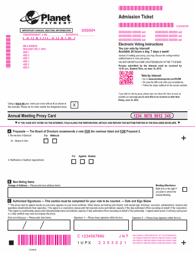 . PROXY FORM FOR ANNUAL MEETING OF STOCKHOLDERS TO BE HELD ON JUNE 16, 2015 PLEASE RETURN FORM BY JUNE 12, 2015 THIS PROXY IS SOLICITED ON BEHALF OF THE BOARD OF DIRECTORS The undersigned hereby appoints Carl Williams and Robert Cox, or either of them, as proxies each with full powers of substitution, and hereby authorizes them to represent and to vote, as designated below, all shares of capital stock of Planet Payment, Inc. (the “Company”) held of record by the undersigned on April 20, 2015 at the Annual Meeting of Stockholders of the Company to be held at 10:00 a.m. New York Time on June 16, 2015 at 670 Long Beach Boulevard, Long Beach, NY 11561, USA, and at any adjournment or postponement thereof. This proxy, when properly executed and returned in a timely manner, will be voted at this Annual Meeting and any adjournment or postponement thereof in the manner described herein. IF NO CONTRARY INDICATION IS MADE, THE PROXY WILL BE VOTED “FOR” THE NOMINEE, “FOR” THE PROPOSAL AND IN THE DISCRETION OF THE PROXIES ON ANY OTHER BUSINESS MATTERS OR PROPOSALS AS MAY PROPERLY COME BEFORE THE ANNUAL MEETING. The undersigned stockholder may revoke this proxy at any time before it is voted by delivering to the Corporate Secretary of the Company either a written revocation of the proxy or a duly executed proxy bearing a later date, or by appearing at the Annual Meeting and voting in person. In their discretion, the Proxies are authorized to vote upon such other business as may properly come before the meeting. If you wish to vote in accordance with the Board of Directors' recommendations, just sign where indicated. You need not mark any boxes. (Items to be voted appear on reverse side.) Please return the signed Proxy Card in the enclosed envelope. Planet Payment, Inc. 2015 Annual Meeting Admission Ticket 2015 Annual Meeting of Planet Payment, Inc. Stockholders Tuesday, June 16, 2015 at 10:00 a.m. New York Time 670 Long Beach Boulevard Long Beach, NY 11561 Upon arrival, please present this admission ticket and photo identification at the registration desk. qIF YOU HAVE NOT VOTED VIA THE INTERNET, FOLD ALONG THE PERFORATION, DETACH AND RETURN THE BOTTOM PORTION IN THE ENCLOSED ENVELOPE.q |