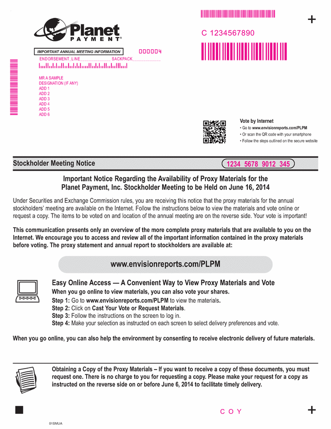 www.envisionreports.com/PLPM Step 1: Go to www.envisionreports.com/PLPM to view the materials. Step 2: Click on Cast Your Vote or Request Materials. Step 3: Follow the instructions on the screen to log in. Vote by Internet • Go to www.envisionreports.com/PLPM • Or scan the QR code with your smartphone • Follow the steps outlined on the secure website Stockholder Meeting Notice 01SMUA + + Important Notice Regarding the Availability of Proxy Materials for the Planet Payment, Inc. Stockholder Meeting to be Held on June 16, 2014 Under Securities and Exchange Commission rules, you are receiving this notice that the proxy materials for the annual stockholders’ meeting are available on the Internet. Follow the instructions below to view the materials and vote online or request a copy. The items to be voted on and location of the annual meeting are on the reverse side. Your vote is important! This communication presents only an overview of the more complete proxy materials that are available to you on the Internet. We encourage you to access and review all of the important information contained in the proxy materials before voting. The proxy statement and annual report to stockholders are available at: Easy Online Access — A Convenient Way to View Proxy Materials and Vote When you go online to view materials, you can also vote your shares. Step 4: Make your selection as instructed on each screen to select delivery preferences and vote. When you go online, you can also help the environment by consenting to receive electronic delivery of future materials. Obtaining a Copy of the Proxy Materials – If you want to receive a copy of these documents, you must request one. There is no charge to you for requesting a copy. Please make your request for a copy as instructed on the reverse side on or before June 6, 2014 to facilitate timely delivery. . IMPORTANT ANNUAL MEETING INFORMATION 1234 5678 9012 345 NNNNNNNNNNNN NNNNNNNNN NNNNNN C 1234567890 C O Y 000004 MR A SAMPLE DESIGNATION (IF ANY) ADD 1 ADD 2 ADD 3 ADD 4 ADD 5 ADD 6 ENDORSEMENT_LINE______________ SACKPACK_____________ |