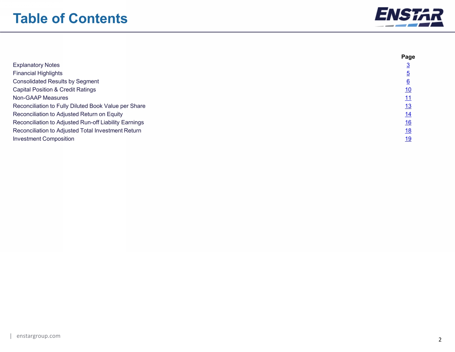 | enstargroup.com 2 Table of Contents Page Explanatory Notes 3 Financial Highlights 5 Consolidated Results by Segment 6 Capital Position & Credit Ratings 10 Non - GAAP Measures 11 Reconciliation to Fully Diluted Book Value per Share 13 Reconciliation to Adjusted Return on Equity 14 Reconciliation to Adjusted Run - off Liability Earnings 16 Reconciliation to Adjusted Total Investment Return 18 Investment Composition 19