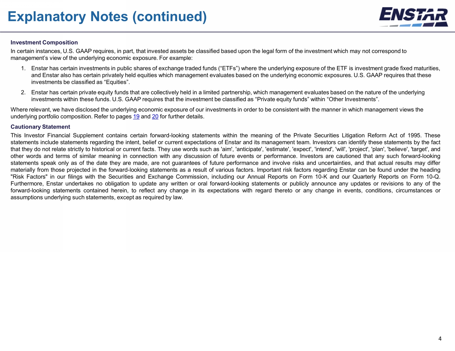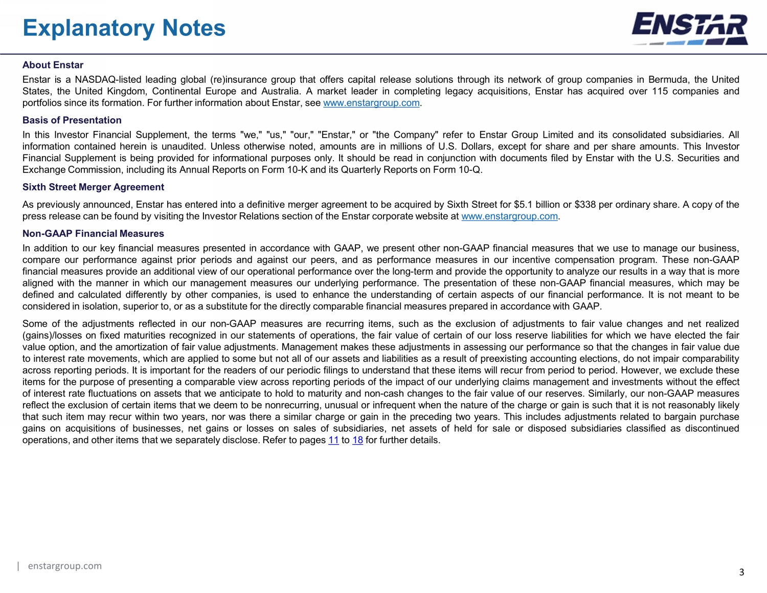 | enstargroup.com 3 Explanatory Notes About Enstar Enstar is a NASDAQ - listed leading global (re)insurance group that offers capital release solutions through its network of group companies in Bermuda, the United States, the United Kingdom, Continental Europe and Australia . A market leader in completing legacy acquisitions, Enstar has acquired over 115 companies and portfolios since its formation . For further information about Enstar, see www . enstargroup . com . Basis of Presentation In this Investor Financial Supplement, the terms "we," "us," "our," "Enstar," or "the Company" refer to Enstar Group Limited and its consolidated subsidiaries . All information contained herein is unaudited . Unless otherwise noted, amounts are in millions of U . S . Dollars, except for share and per share amounts . This Investor Financial Supplement is being provided for informational purposes only . It should be read in conjunction with documents filed by Enstar with the U . S . Securities and Exchange Commission, including its Annual Reports on Form 10 - K and its Quarterly Reports on Form 10 - Q . Sixth Street Merger Agreement As previously announced, Enstar has entered into a definitive merger agreement to be acquired by Sixth Street for $ 5 . 1 billion or $ 338 per ordinary share . A copy of the press release can be found by visiting the Investor Relations section of the Enstar corporate website at www . enstargroup . com . Non - GAAP Financial Measures In addition to our key financial measures presented in accordance with GAAP, we present other non - GAAP financial measures that we use to manage our business, compare our performance against prior periods and against our peers, and as performance measures in our incentive compensation program . These non - GAAP financial measures provide an additional view of our operational performance over the long - term and provide the opportunity to analyze our results in a way that is more aligned with the manner in which our management measures our underlying performance . The presentation of these non - GAAP financial measures, which may be defined and calculated differently by other companies, is used to enhance the understanding of certain aspects of our financial performance . It is not meant to be considered in isolation, superior to, or as a substitute for the directly comparable financial measures prepared in accordance with GAAP . Some of the adjustments reflected in our non - GAAP measures are recurring items, such as the exclusion of adjustments to fair value changes and net realized (gains)/losses on fixed maturities recognized in our statements of operations, the fair value of certain of our loss reserve liabilities for which we have elected the fair value option, and the amortization of fair value adjustments . Management makes these adjustments in assessing our performance so that the changes in fair value due to interest rate movements, which are applied to some but not all of our assets and liabilities as a result of preexisting accounting elections, do not impair comparability across reporting periods . It is important for the readers of our periodic filings to understand that these items will recur from period to period . However, we exclude these items for the purpose of presenting a comparable view across reporting periods of the impact of our underlying claims management and investments without the effect of interest rate fluctuations on assets that we anticipate to hold to maturity and non - cash changes to the fair value of our reserves . Similarly, our non - GAAP measures reflect the exclusion of certain items that we deem to be nonrecurring, unusual or infrequent when the nature of the charge or gain is such that it is not reasonably likely that such item may recur within two years, nor was there a similar charge or gain in the preceding two years . This includes adjustments related to bargain purchase gains on acquisitions of businesses, net gains or losses on sales of subsidiaries, net assets of held for sale or disposed subsidiaries classified as discontinued operations, and other items that we separately disclose . Refer to pages 11 to 18 for further details .