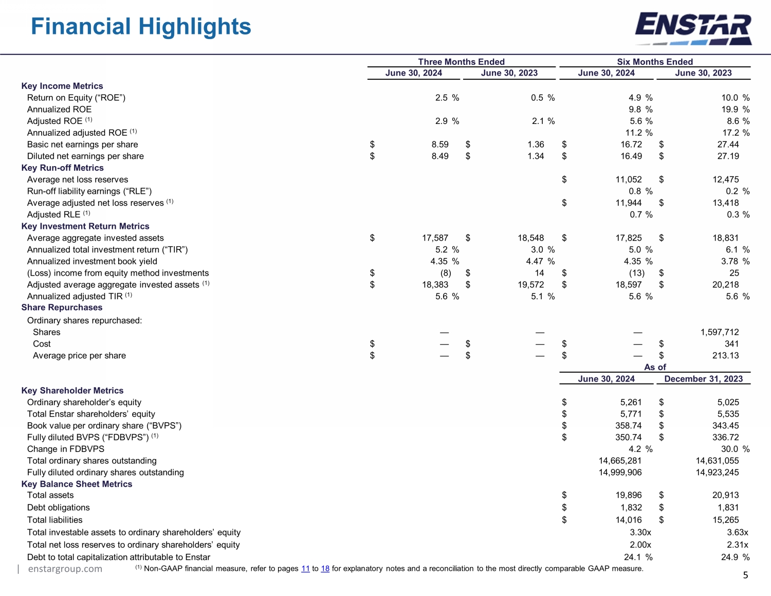| enstargroup.com 5 Three Months Ended Six Months Ended June 30, 2024 June 30, 2023 June 30, 2024 June 30, 2023 Key Income Metrics Return on Equity (“ROE”) 2.5 % 0.5 % 4.9 % 10.0 % Annualized ROE 9.8 % 19.9 % Adjusted ROE (1) 2.9 % 2.1 % 5.6 % 8.6 % Annualized adjusted ROE (1) 11.2 % 17.2 % Basic net earnings per share $ 8.59 $ 1.36 $ 16.72 $ 27.44 Diluted net earnings per share $ 8.49 $ 1.34 $ 16.49 $ 27.19 Key Run - off Metrics Average net loss reserves $ 11,052 $ 12,475 Run - off liability earnings (“RLE”) 0.8 % 0.2 % Average adjusted net loss reserves (1) $ 11,944 $ 13,418 Adjusted RLE (1) 0.7 % 0.3 % Key Investment Return Metrics Average aggregate invested assets $ 17,587 $ 18,548 $ 17,825 $ 18,831 Annualized total investment return (“TIR”) 5.2 % 3.0 % 5.0 % 6.1 % Annualized investment book yield 4.35 % 4.47 % 4.35 % 3.78 % (Loss) income from equity method investments $ (8) $ 14 $ (13) $ 25 Adjusted average aggregate invested assets (1) $ 18,383 $ 19,572 $ 18,597 $ 20,218 Annualized adjusted TIR (1) 5.6 % 5.1 % 5.6 % 5.6 % Share Repurchases Ordinary shares repurchased: Shares — — — 1,597,712 Cost $ — $ — $ — $ 341 Average price per share $ — $ — $ — $ 213.13 As of June 30, 2024 December 31, 2023 Key Shareholder Metrics Ordinary shareholder’s equity $ 5,261 $ 5,025 Total Enstar shareholders’ equity $ 5,771 $ 5,535 Book value per ordinary share (“BVPS”) $ 358.74 $ 343.45 Fully diluted BVPS (“FDBVPS”) (1) $ 350.74 $ 336.72 Change in FDBVPS 4.2 % 30.0 % Total ordinary shares outstanding 14,665,281 14,631,055 Fully diluted ordinary shares outstanding 14,999,906 14,923,245 Key Balance Sheet Metrics Total assets $ 19,896 $ 20,913 Debt obligations $ 1,832 $ 1,831 Total liabilities $ 14,016 $ 15,265 Total investable assets to ordinary shareholders’ equity 3.30x 3.63x Total net loss reserves to ordinary shareholders’ equity 2.00x 2.31x Debt to total capitalization attributable to Enstar 24.1 % 24.9 % Financial Highlights (1) Non - GAAP financial measure, refer to pages 11 to 18 for explanatory notes and a reconciliation to the most directly comparable GAAP measure.
