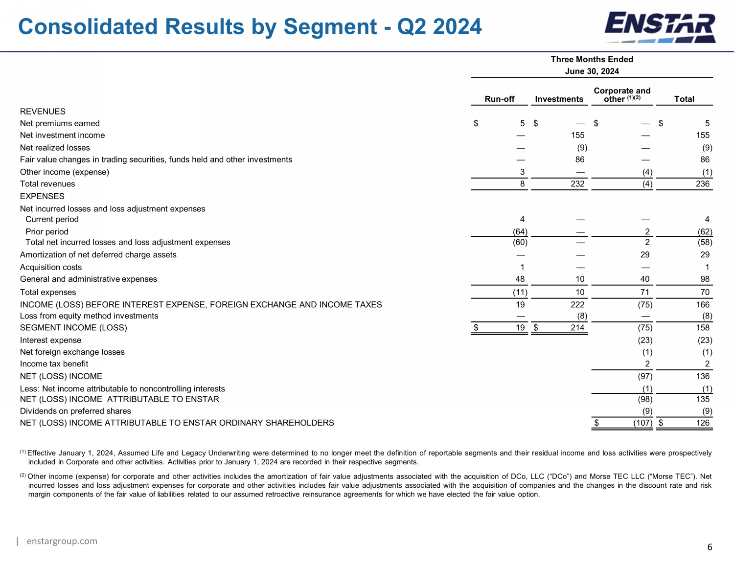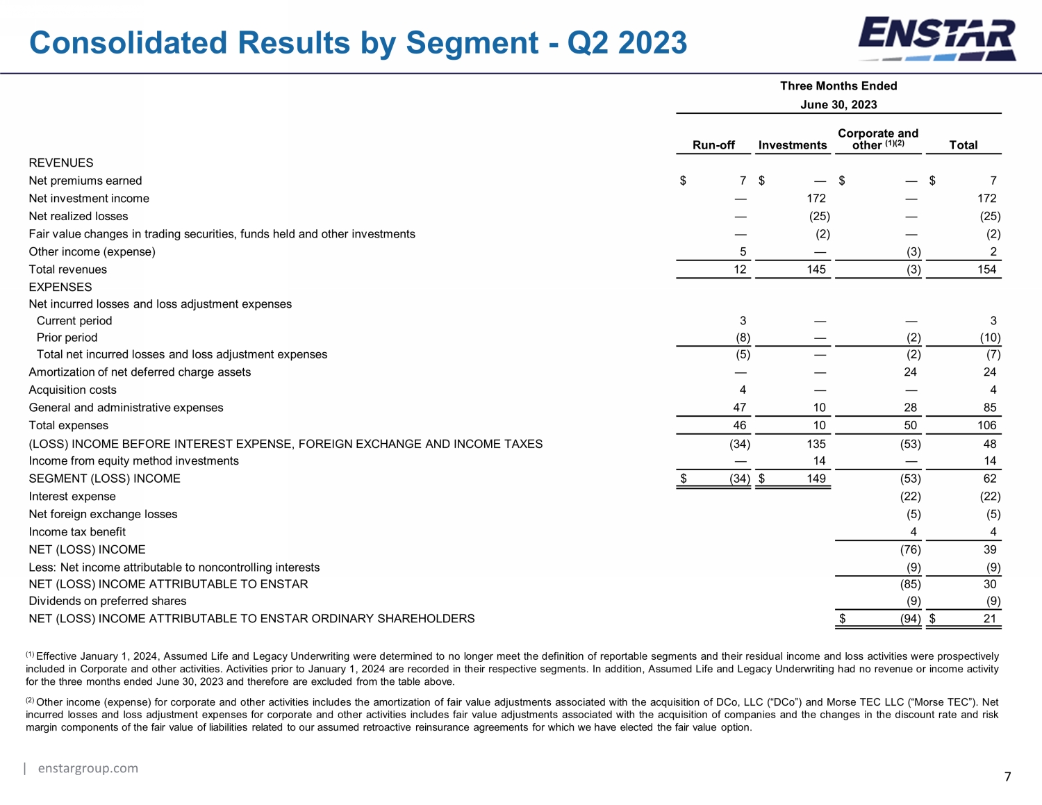 | enstargroup.com 6 Consolidated Results by Segment - Q2 2024 Three Months Ended June 30, 2024 Run - off Investments Corporate and other (1)(2) Total REVENUES Net premiums earned $ 5 $ — $ — $ 5 Net investment income — 155 — 155 Net realized losses — (9) — (9) Fair value changes in trading securities, funds held and other investments — 86 — 86 Other income (expense) 3 — (4) (1) Total revenues 8 232 (4) 236 EXPENSES Net incurred losses and loss adjustment expenses Current period 4 — — 4 Prior period (64) — 2 (62) Total net incurred losses and loss adjustment expenses (60) — 2 (58) Amortization of net deferred charge assets — — 29 29 Acquisition costs 1 — — 1 General and administrative expenses 48 10 40 98 Total expenses (11) 10 71 70 INCOME (LOSS) BEFORE INTEREST EXPENSE, FOREIGN EXCHANGE AND INCOME TAXES 19 222 (75) 166 Loss from equity method investments — (8) — (8) SEGMENT INCOME (LOSS) $ 19 $ 214 (75) 158 Interest expense (23) (23) Net foreign exchange losses (1) (1) Income tax benefit 2 2 NET (LOSS) INCOME (97) 136 Less: Net income attributable to noncontrolling interests (1) (1) NET (LOSS) INCOME ATTRIBUTABLE TO ENSTAR (98) 135 Dividends on preferred shares (9) (9) NET (LOSS) INCOME ATTRIBUTABLE TO ENSTAR ORDINARY SHAREHOLDERS $ (107) $ 126 ( 1 ) Effective January 1 , 2024 , Assumed Life and Legacy Underwriting were determined to no longer meet the definition of reportable segments and their residual income and loss activities were prospectively included in Corporate and other activities . Activities prior to January 1 , 2024 are recorded in their respective segments . ( 2 ) Other income (expense) for corporate and other activities includes the amortization of fair value adjustments associated with the acquisition of DCo, LLC (“DCo”) and Morse TEC LLC (“Morse TEC”) . Net incurred losses and loss adjustment expenses for corporate and other activities includes fair value adjustments associated with the acquisition of companies and the changes in the discount rate and risk margin components of the fair value of liabilities related to our assumed retroactive reinsurance agreements for which we have elected the fair value option .