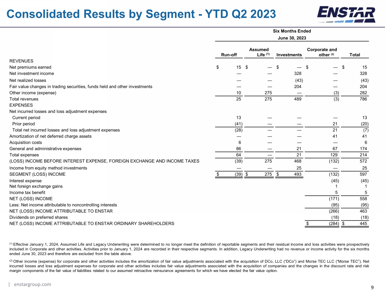| enstargroup.com 9 Consolidated Results by Segment - YTD Q2 2023 Six Months Ended June 30, 2023 Run - off Assumed Life (1) Investments Corporate and other (2) Total REVENUES Net premiums earned $ 15 $ — $ — $ — $ 15 Net investment income — — 328 — 328 Net realized losses — — (43) — (43) Fair value changes in trading securities, funds held and other investments — — 204 — 204 Other income (expense) 10 275 — (3) 282 Total revenues 25 275 489 (3) 786 EXPENSES Net incurred losses and loss adjustment expenses Current period 13 — — — 13 Prior period (41) — — 21 (20) Total net incurred losses and loss adjustment expenses (28) — — 21 (7) Amortization of net deferred charge assets — — — 41 41 Acquisition costs 6 — — — 6 General and administrative expenses 86 — 21 67 174 Total expenses 64 — 21 129 214 (LOSS) INCOME BEFORE INTEREST EXPENSE, FOREIGN EXCHANGE AND INCOME TAXES (39) 275 468 (132) 572 Income from equity method investments — — 25 — 25 SEGMENT (LOSS) INCOME $ (39) $ 275 $ 493 (132) 597 Interest expense (45) (45) Net foreign exchange gains 1 1 Income tax benefit 5 5 NET (LOSS) INCOME (171) 558 Less: Net income attributable to noncontrolling interests (95) (95) NET (LOSS) INCOME ATTRIBUTABLE TO ENSTAR (266) 463 Dividends on preferred shares (18) (18) NET (LOSS) INCOME ATTRIBUTABLE TO ENSTAR ORDINARY SHAREHOLDERS $ (284) $ 445 ( 1 ) Effective January 1 , 2024 , Assumed Life and Legacy Underwriting were determined to no longer meet the definition of reportable segments and their residual income and loss activities were prospectively included in Corporate and other activities . Activities prior to January 1 , 2024 are recorded in their respective segments . In addition, Legacy Underwriting had no revenue or income activity for the six months ended June 30 , 2023 and therefore are excluded from the table above . ( 2 ) Other income (expense) for corporate and other activities includes the amortization of fair value adjustments associated with the acquisition of DCo, LLC (“DCo”) and Morse TEC LLC (“Morse TEC”) . Net incurred losses and loss adjustment expenses for corporate and other activities includes fair value adjustments associated with the acquisition of companies and the changes in the discount rate and risk margin components of the fair value of liabilities related to our assumed retroactive reinsurance agreements for which we have elected the fair value option .
