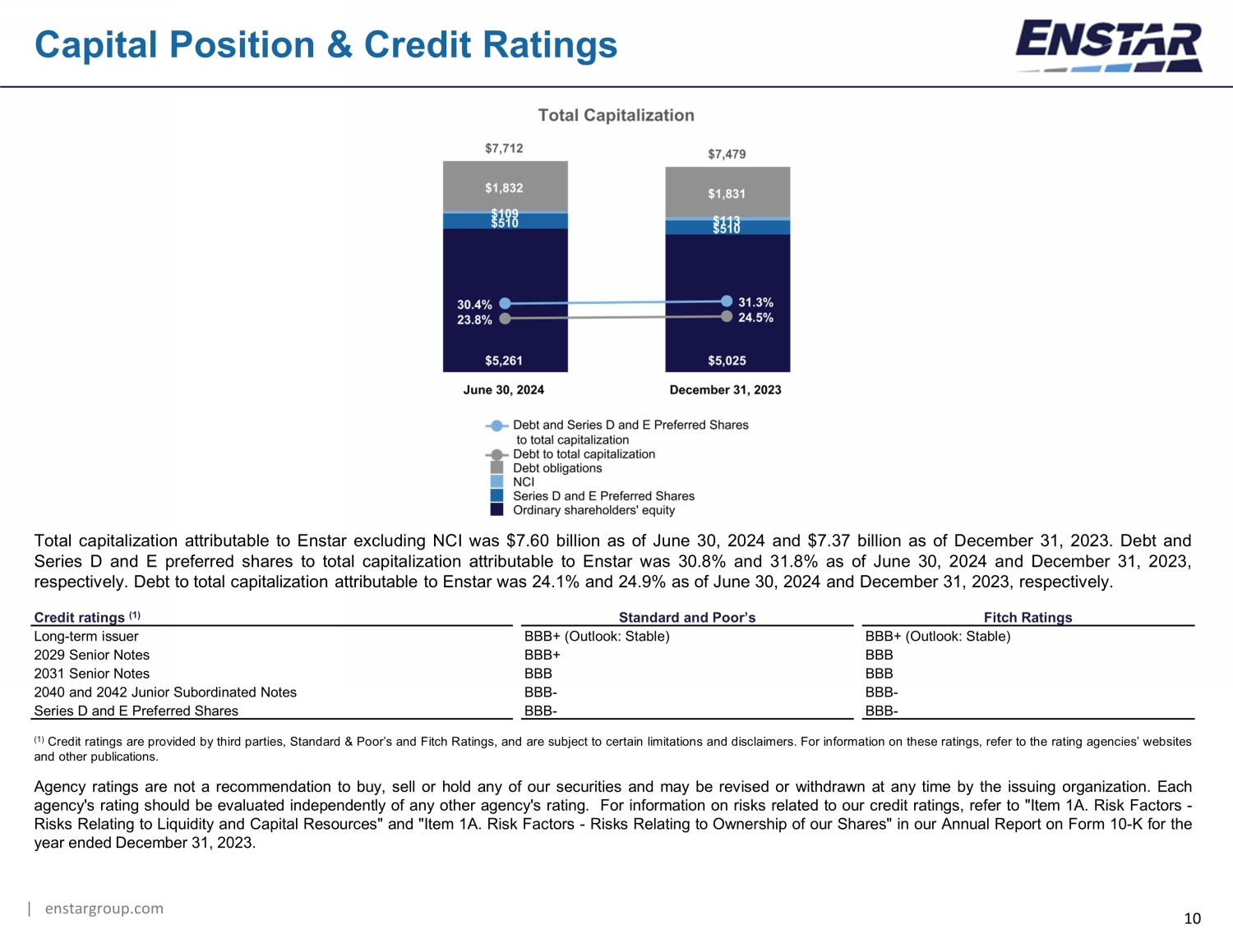 | enstargroup.com 10 Capital Position & Credit Ratings Credit ratings (1) Standard and Poor’s Fitch Ratings Long - term issuer BBB+ (Outlook: Stable) BBB+ (Outlook: Stable) 2029 Senior Notes BBB+ BBB 2031 Senior Notes BBB BBB 2040 and 2042 Junior Subordinated Notes BBB - BBB - Series D and E Preferred Shares BBB - BBB - ( 1 ) Credit ratings are provided by third parties, Standard & Poor’s and Fitch Ratings, and are subject to certain limitations and disclaimers . For information on these ratings, refer to the rating agencies’ websites and other publications . Agency ratings are not a recommendation to buy, sell or hold any of our securities and may be revised or withdrawn at any time by the issuing organization . Each agency's rating should be evaluated independently of any other agency's rating . For information on risks related to our credit ratings, refer to "Item 1 A . Risk Factors - Risks Relating to Liquidity and Capital Resources" and "Item 1 A . Risk Factors - Risks Relating to Ownership of our Shares" in our Annual Report on Form 10 - K for the year ended December 31 , 2023 . Total capitalization attributable to Enstar excluding NCI was $ 7 . 60 billion as of June 30 , 2024 and $ 7 . 37 billion as of December 31 , 2023 . Debt and Series D and E preferred shares to total capitalization attributable to Enstar was 30 . 8 % and 31 . 8 % as of June 30 , 2024 and December 31 , 2023 , respectively . Debt to total capitalization attributable to Enstar was 24 . 1 % and 24 . 9 % as of June 30 , 2024 and December 31 , 2023 , respectively .