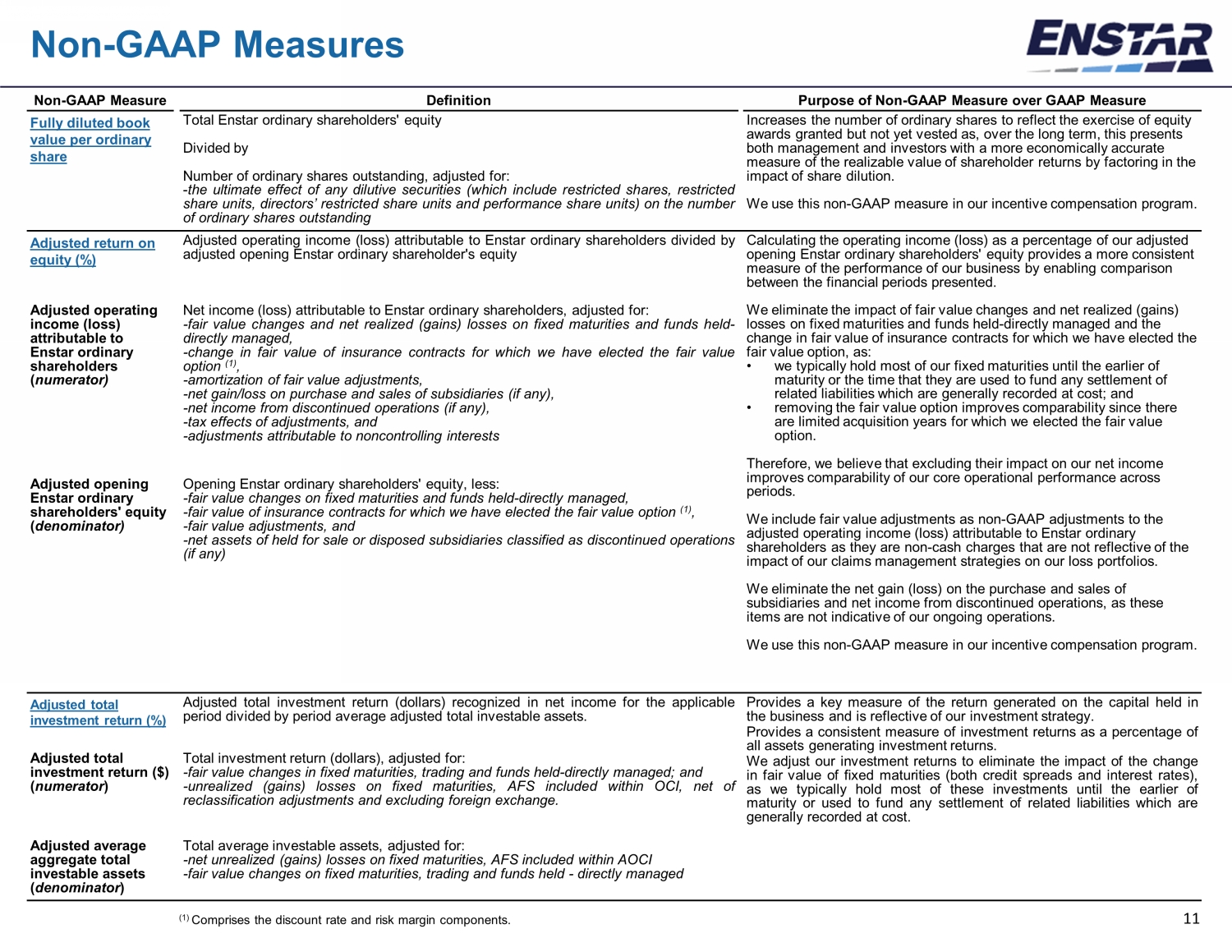 11 Non - GAAP Measures Non - GAAP Measure Definition Purpose of Non - GAAP Measure over GAAP Measure Fully diluted book value per ordinary share Total Enstar ordinary shareholders' equity Divided by Number of ordinary shares outstanding, adjusted for : - the ultimate effect of any dilutive securities (which include restricted shares, restricted share units, directors’ restricted share units and performance share units) on the number of ordinary shares outstanding Increases the number of ordinary shares to reflect the exercise of equity awards granted but not yet vested as, over the long term, this presents both management and investors with a more economically accurate measure of the realizable value of shareholder returns by factoring in the impact of share dilution. We use this non - GAAP measure in our incentive compensation program. Adjusted return on equity (%) Adjusted operating income (loss) attributable to Enstar ordinary shareholders divided by adjusted opening Enstar ordinary shareholder's equity Calculating the operating income (loss) as a percentage of our adjusted opening Enstar ordinary shareholders' equity provides a more consistent measure of the performance of our business by enabling comparison between the financial periods presented. We eliminate the impact of fair value changes and net realized (gains) losses on fixed maturities and funds held - directly managed and the change in fair value of insurance contracts for which we have elected the fair value option, as: • we typically hold most of our fixed maturities until the earlier of maturity or the time that they are used to fund any settlement of related liabilities which are generally recorded at cost; and • removing the fair value option improves comparability since there are limited acquisition years for which we elected the fair value option. Therefore, we believe that excluding their impact on our net income improves comparability of our core operational performance across periods. We include fair value adjustments as non - GAAP adjustments to the adjusted operating income (loss) attributable to Enstar ordinary shareholders as they are non - cash charges that are not reflective of the impact of our claims management strategies on our loss portfolios. We eliminate the net gain (loss) on the purchase and sales of subsidiaries and net income from discontinued operations, as these items are not indicative of our ongoing operations. We use this non - GAAP measure in our incentive compensation program. Adjusted operating income (loss) attributable to Enstar ordinary shareholders ( numerator) Net income (loss) attributable to Enstar ordinary shareholders, adjusted for : - fair value changes and net realized (gains) losses on fixed maturities and funds held - directly managed, - change in fair value of insurance contracts for which we have elected the fair value option ( 1 ) , - amortization of fair value adjustments, - net gain/loss on purchase and sales of subsidiaries (if any), - net income from discontinued operations (if any), - tax effects of adjustments, and - adjustments attributable to noncontrolling interests Adjusted opening Enstar ordinary shareholders' equity ( denominator) Opening Enstar ordinary shareholders' equity, less : - fair value changes on fixed maturities and funds held - directly managed, - fair value of insurance contracts for which we have elected the fair value option ( 1 ) , - fair value adjustments, and - net assets of held for sale or disposed subsidiaries classified as discontinued operations (if any) Adjusted total investment return (%) Adjusted total investment return (dollars) recognized in net income for the applicable period divided by period average adjusted total investable assets . Provides a key measure of the return generated on the capital held in the business and is reflective of our investment strategy . Provides a consistent measure of investment returns as a percentage of all assets generating investment returns . We adjust our investment returns to eliminate the impact of the change in fair value of fixed maturities (both credit spreads and interest rates), as we typically hold most of these investments until the earlier of maturity or used to fund any settlement of related liabilities which are generally recorded at cost . Adjusted total investment return ($) ( numerator ) Total investment return (dollars), adjusted for : - fair value changes in fixed maturities, trading and funds held - directly managed ; and - unrealized (gains) losses on fixed maturities, AFS included within OCI, net of reclassification adjustments and excluding foreign exchange . Adjusted average aggregate total investable assets ( denominator ) Total average investable assets, adjusted for : - net unrealized (gains) losses on fixed maturities, AFS included within AOCI - fair value changes on fixed maturities, trading and funds held - directly managed (1) Comprises the discount rate and risk margin components.