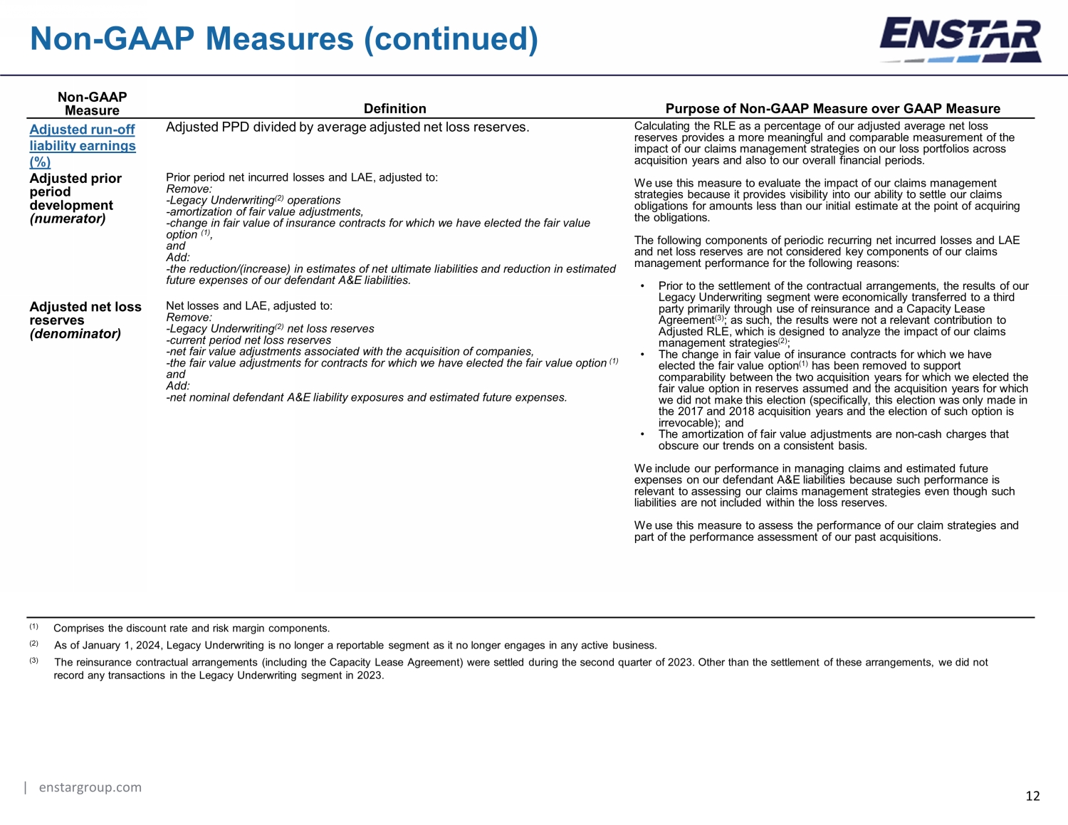 | enstargroup.com 12 Non - GAAP Measures (continued) Non - GAAP Measure Definition Purpose of Non - GAAP Measure over GAAP Measure Adjusted run - off liability earnings (%) Adjusted PPD divided by average adjusted net loss reserves. Calculating the RLE as a percentage of our adjusted average net loss reserves provides a more meaningful and comparable measurement of the impact of our claims management strategies on our loss portfolios across acquisition years and also to our overall financial periods. We use this measure to evaluate the impact of our claims management strategies because it provides visibility into our ability to settle our claims obligations for amounts less than our initial estimate at the point of acquiring the obligations. The following components of periodic recurring net incurred losses and LAE and net loss reserves are not considered key components of our claims management performance for the following reasons: • Prior to the settlement of the contractual arrangements, the results of our Legacy Underwriting segment were economically transferred to a third party primarily through use of reinsurance and a Capacity Lease Agreement (3) ; as such, the results were not a relevant contribution to Adjusted RLE, which is designed to analyze the impact of our claims management strategies (2) ; • The change in fair value of insurance contracts for which we have elected the fair value option (1) has been removed to support comparability between the two acquisition years for which we elected the fair value option in reserves assumed and the acquisition years for which we did not make this election (specifically, this election was only made in the 2017 and 2018 acquisition years and the election of such option is irrevocable); and • The amortization of fair value adjustments are non - cash charges that obscure our trends on a consistent basis. We include our performance in managing claims and estimated future expenses on our defendant A&E liabilities because such performance is relevant to assessing our claims management strategies even though such liabilities are not included within the loss reserves. We use this measure to assess the performance of our claim strategies and part of the performance assessment of our past acquisitions. Adjusted prior period development (numerator) Prior period net incurred losses and LAE, adjusted to: Remove: - Legacy Underwriting (2) operations - amortization of fair value adjustments, - change in fair value of insurance contracts for which we have elected the fair value option (1) , and Add: - the reduction/(increase) in estimates of net ultimate liabilities and reduction in estimated future expenses of our defendant A&E liabilities. Adjusted net loss reserves (denominator) Net losses and LAE, adjusted to: Remove: - Legacy Underwriting (2) net loss reserves - current period net loss reserves - net fair value adjustments associated with the acquisition of companies, - the fair value adjustments for contracts for which we have elected the fair value option (1) and Add: - net nominal defendant A&E liability exposures and estimated future expenses. (1) Comprises the discount rate and risk margin components. (2) As of January 1, 2024, Legacy Underwriting is no longer a reportable segment as it no longer engages in any active business. (3) The reinsurance contractual arrangements (including the Capacity Lease Agreement) were settled during the second quarter of 2 023 . Other than the settlement of these arrangements, we did not record any transactions in the Legacy Underwriting segment in 2023.