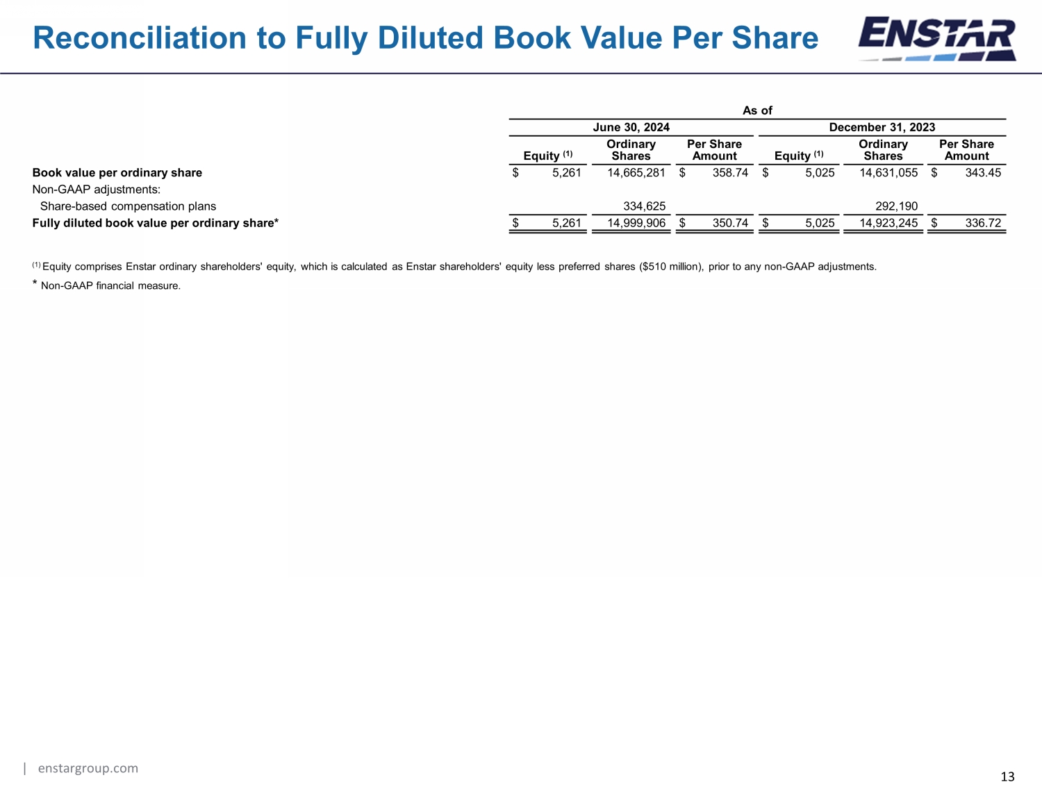 | enstargroup.com 13 Reconciliation to Fully Diluted Book Value Per Share As of June 30, 2024 December 31, 2023 Equity (1) Ordinary Shares Per Share Amount Equity (1) Ordinary Shares Per Share Amount Book value per ordinary share $ 5,261 14,665,281 $ 358.74 $ 5,025 14,631,055 $ 343.45 Non - GAAP adjustments: Share - based compensation plans 334,625 292,190 Fully diluted book value per ordinary share* $ 5,261 14,999,906 $ 350.74 $ 5,025 14,923,245 $ 336.72 (1) Equity comprises Enstar ordinary shareholders' equity, which is calculated as Enstar shareholders' equity less preferred shar es ($510 million), prior to any non - GAAP adjustments. * Non - GAAP financial measure.