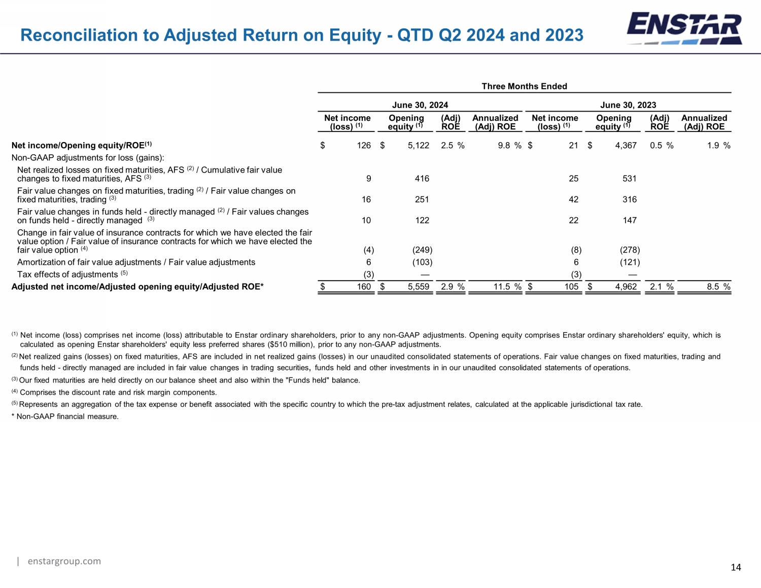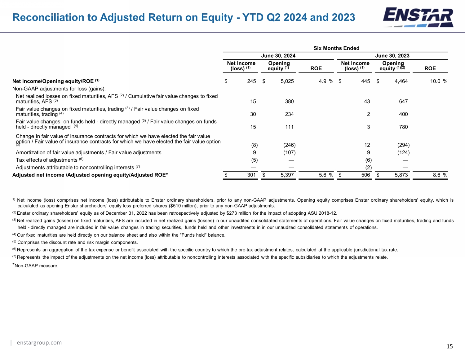 | enstargroup.com 14 Reconciliation to Adjusted Return on Equity - QTD Q2 2024 and 2023 ( 1 ) Net income (loss) comprises net income (loss) attributable to Enstar ordinary shareholders, prior to any non - GAAP adjustments . Opening equity comprises Enstar ordinary shareholders' equity, which is calculated as opening Enstar shareholders' equity less preferred shares ( $ 510 million), prior to any non - GAAP adjustments . ( 2 ) Net realized gains (losses) on fixed maturities, AFS are included in net realized gains (losses) in our unaudited consolidated statements of operations . Fair value changes on fixed maturities, trading and funds held - directly managed are included in fair value changes in trading securities , funds held and other investments in in our unaudited consolidated statements of operations . ( 3 ) Our fixed maturities are held directly on our balance sheet and also within the "Funds held" balance . ( 4 ) Comprises the discount rate and risk margin components . ( 5 ) Represents an aggregation of the tax expense or benefit associated with the specific country to which the pre - tax adjustment relates, calculated at the applicable jurisdictional tax rate . * Non - GAAP financial measure. Three Months Ended June 30, 2024 June 30, 2023 Net income (loss) (1) Opening equity (1) (Adj) ROE Annualized (Adj) ROE Net income (loss) (1) Opening equity (1) (Adj) ROE Annualized (Adj) ROE Net income/Opening equity/ROE (1) $ 126 $ 5,122 2.5 % 9.8 % $ 21 $ 4,367 0.5 % 1.9 % Non - GAAP adjustments for loss (gains): Net realized losses on fixed maturities, AFS (2) / Cumulative fair value changes to fixed maturities, AFS (3) 9 416 25 531 Fair value changes on fixed maturities, trading (2) / Fair value changes on fixed maturities, trading (3) 16 251 42 316 Fair value changes in funds held - directly managed (2) / Fair values changes on funds held - directly managed (3) 10 122 22 147 Change in fair value of insurance contracts for which we have elected the fair value option / Fair value of insurance contracts for which we have elected the fair value option (4) (4) (249) (8) (278) Amortization of fair value adjustments / Fair value adjustments 6 (103) 6 (121) Tax effects of adjustments (5) (3) — (3) — Adjusted net income/Adjusted opening equity/Adjusted ROE* $ 160 $ 5,559 2.9 % 11.5 % $ 105 $ 4,962 2.1 % 8.5 %