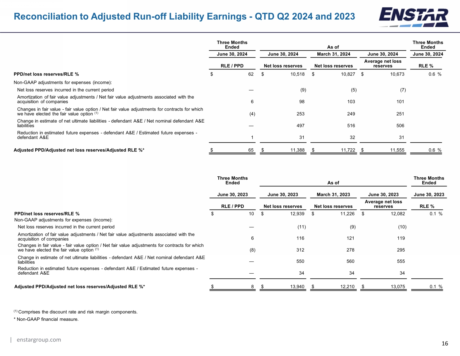 | enstargroup.com 16 Reconciliation to Adjusted Run - off Liability Earnings - QTD Q2 2024 and 2023 Three Months Ended As of Three Months Ended June 30, 2024 June 30, 2024 March 31, 2024 June 30, 2024 June 30, 2024 RLE / PPD Net loss reserves Net loss reserves Average net loss reserves RLE % PPD/net loss reserves/RLE % $ 62 $ 10,518 $ 10,827 $ 10,673 0.6 % Non - GAAP adjustments for expenses (income): Net loss reserves incurred in the current period — (9) (5) (7) Amortization of fair value adjustments / Net fair value adjustments associated with the acquisition of companies 6 98 103 101 Changes in fair value - fair value option / Net fair value adjustments for contracts for which we have elected the fair value option (1) (4) 253 249 251 Change in estimate of net ultimate liabilities - defendant A&E / Net nominal defendant A&E liabilities — 497 516 506 Reduction in estimated future expenses - defendant A&E / Estimated future expenses - defendant A&E 1 31 32 31 Adjusted PPD/Adjusted net loss reserves/Adjusted RLE %* $ 65 $ 11,388 $ 11,722 $ 11,555 0.6 % (1) Comprises the discount rate and risk margin components. * Non - GAAP financial measure. Three Months Ended As of Three Months Ended June 30, 2023 June 30, 2023 March 31, 2023 June 30, 2023 June 30, 2023 RLE / PPD Net loss reserves Net loss reserves Average net loss reserves RLE % PPD/net loss reserves/RLE % $ 10 $ 12,939 $ 11,226 $ 12,082 0.1 % Non - GAAP adjustments for expenses (income): Net loss reserves incurred in the current period — (11) (9) (10) Amortization of fair value adjustments / Net fair value adjustments associated with the acquisition of companies 6 116 121 119 Changes in fair value - fair value option / Net fair value adjustments for contracts for which we have elected the fair value option (1) (8) 312 278 295 Change in estimate of net ultimate liabilities - defendant A&E / Net nominal defendant A&E liabilities — 550 560 555 Reduction in estimated future expenses - defendant A&E / Estimated future expenses - defendant A&E — 34 34 34 Adjusted PPD/Adjusted net loss reserves/Adjusted RLE %* $ 8 $ 13,940 $ 12,210 $ 13,075 0.1 %