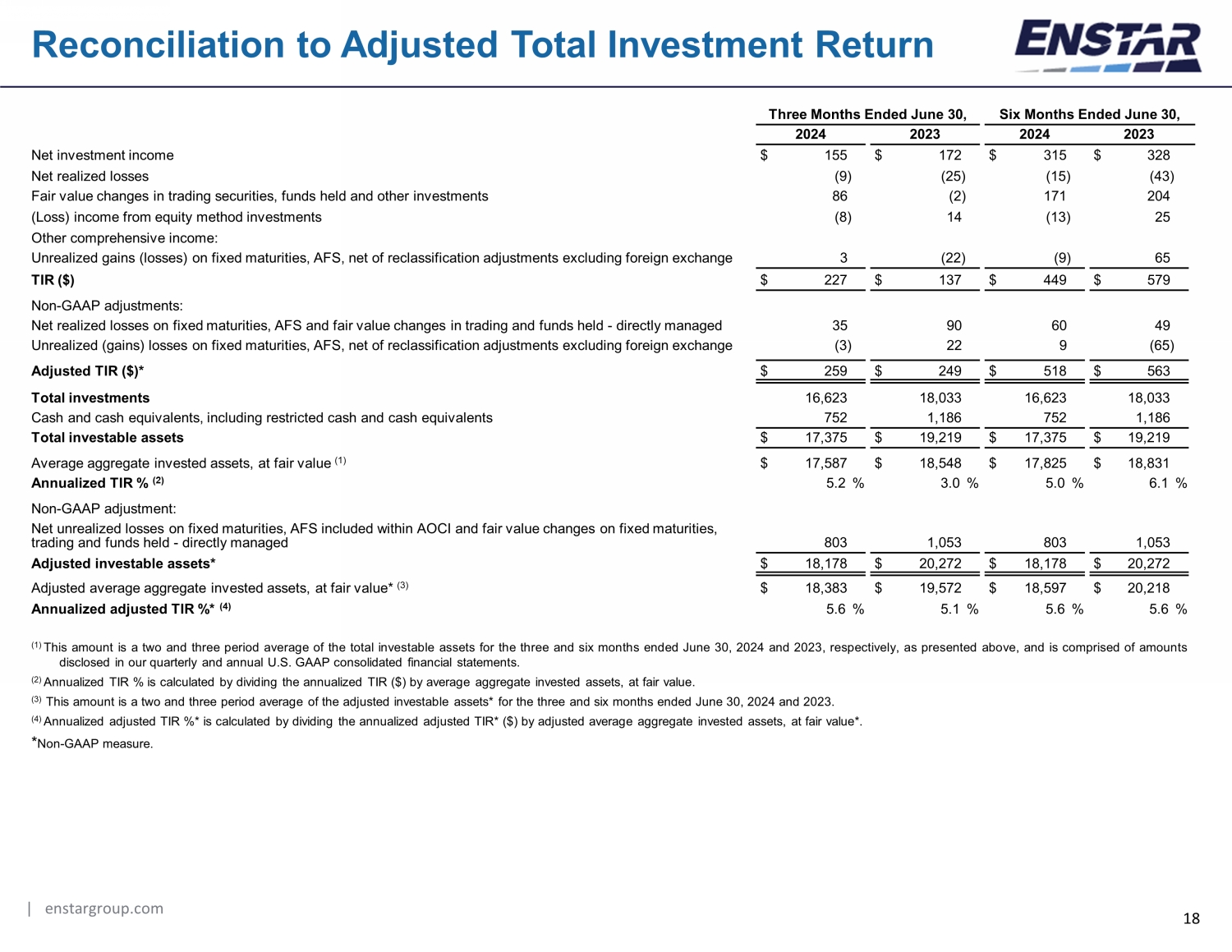 | enstargroup.com 18 Reconciliation to Adjusted Total Investment Return Three Months Ended June 30, Six Months Ended June 30, 2024 2023 2024 2023 Net investment income $ 155 $ 172 $ 315 $ 328 Net realized losses (9) (25) (15) (43) Fair value changes in trading securities, funds held and other investments 86 (2) 171 204 (Loss) income from equity method investments (8) 14 (13) 25 Other comprehensive income: Unrealized gains (losses) on fixed maturities, AFS, net of reclassification adjustments excluding foreign exchange 3 (22) (9) 65 TIR ($) $ 227 $ 137 $ 449 $ 579 Non - GAAP adjustments: Net realized losses on fixed maturities, AFS and fair value changes in trading and funds held - directly managed 35 90 60 49 Unrealized (gains) losses on fixed maturities, AFS, net of reclassification adjustments excluding foreign exchange (3) 22 9 (65) Adjusted TIR ($)* $ 259 $ 249 $ 518 $ 563 Total investments 16,623 18,033 16,623 18,033 Cash and cash equivalents, including restricted cash and cash equivalents 752 1,186 752 1,186 Total investable assets $ 17,375 $ 19,219 $ 17,375 $ 19,219 Average aggregate invested assets, at fair value (1) $ 17,587 $ 18,548 $ 17,825 $ 18,831 Annualized TIR % (2) 5.2 % 3.0 % 5.0 % 6.1 % Non - GAAP adjustment: Net unrealized losses on fixed maturities, AFS included within AOCI and fair value changes on fixed maturities, trading and funds held - directly managed 803 1,053 803 1,053 Adjusted investable assets* $ 18,178 $ 20,272 $ 18,178 $ 20,272 Adjusted average aggregate invested assets, at fair value* (3) $ 18,383 $ 19,572 $ 18,597 $ 20,218 Annualized adjusted TIR %* (4) 5.6 % 5.1 % 5.6 % 5.6 % ( 1 ) This amount is a two and three period average of the total investable assets for the three and six months ended June 30 , 2024 and 2023 , respectively, as presented above, and is comprised of amounts disclosed in our quarterly and annual U . S . GAAP consolidated financial statements . ( 2 ) Annualized TIR % is calculated by dividing the annualized TIR ( $ ) by average aggregate invested assets, at fair value . ( 3 ) This amount is a two and three period average of the adjusted investable assets* for the three and six months ended June 30 , 2024 and 2023 . ( 4 ) Annualized adjusted TIR % * is calculated by dividing the annualized adjusted TIR* ( $ ) by adjusted average aggregate invested assets, at fair value* . * Non - GAAP measure .