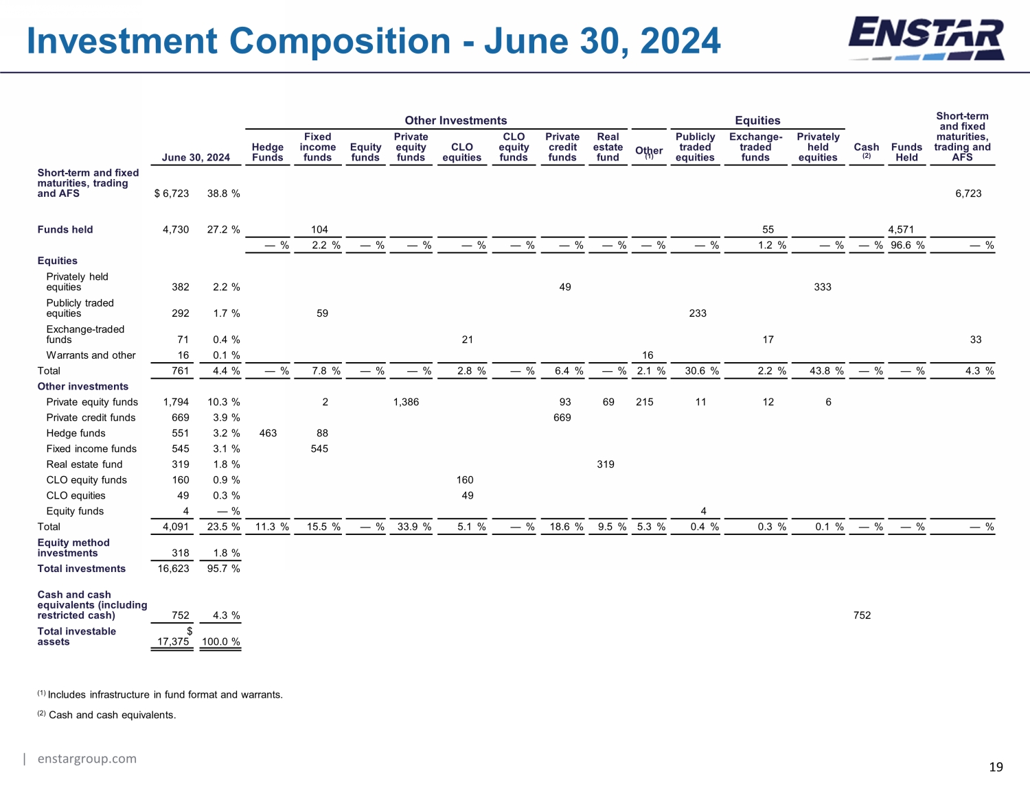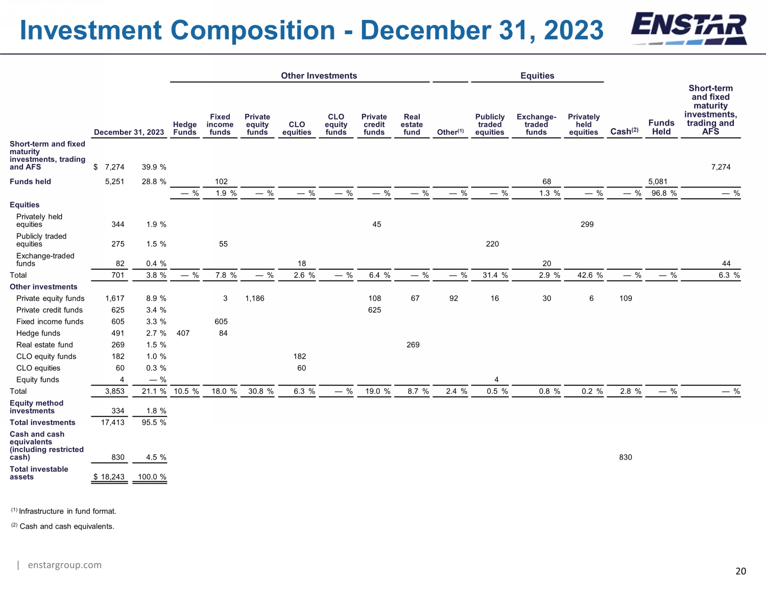| enstargroup.com 19 Investment Composition - June 30, 2024 Other Investments Equities Cash (2) Funds Held Short - term and fixed maturities, trading and AFS June 30, 2024 Hedge Funds Fixed income funds Equity funds Private equity funds CLO equities CLO equity funds Private credit funds Real estate fund Other (1) Publicly traded equities Exchange - traded funds Privately held equities Short - term and fixed maturities, trading and AFS $ 6,723 38.8 % 6,723 Funds held 4,730 27.2 % 104 55 4,571 — % 2.2 % — % — % — % — % — % — % — % — % 1.2 % — % — % 96.6 % — % Equities Privately held equities 382 2.2 % 49 333 Publicly traded equities 292 1.7 % 59 233 Exchange - traded funds 71 0.4 % 21 17 33 Warrants and other 16 0.1 % 16 Total 761 4.4 % — % 7.8 % — % — % 2.8 % — % 6.4 % — % 2.1 % 30.6 % 2.2 % 43.8 % — % — % 4.3 % Other investments Private equity funds 1,794 10.3 % 2 1,386 93 69 215 11 12 6 Private credit funds 669 3.9 % 669 Hedge funds 551 3.2 % 463 88 Fixed income funds 545 3.1 % 545 Real estate fund 319 1.8 % 319 CLO equity funds 160 0.9 % 160 CLO equities 49 0.3 % 49 Equity funds 4 — % 4 Total 4,091 23.5 % 11.3 % 15.5 % — % 33.9 % 5.1 % — % 18.6 % 9.5 % 5.3 % 0.4 % 0.3 % 0.1 % — % — % — % Equity method investments 318 1.8 % Total investments 16,623 95.7 % Cash and cash equivalents (including restricted cash) 752 4.3 % 752 Total investable assets $ 17,375 100.0 % (1) Includes infrastructure in fund format and warrants. (2) Cash and cash equivalents.