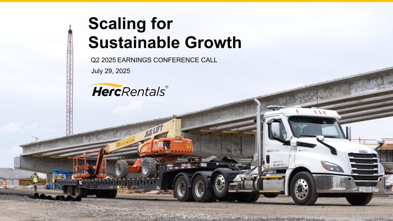 Q2 2025Herc Holdings Inc. NYSE: HRI 3 Safe Harbor Statements and Non-GAAP Financial Measures Forward-Looking Statements This presentation includes forward-looking statements within the meaning of Section 21E of the Securities Exchange Act, as amended, and the Private Securities Litigation Reform Act of 1995. Forward looking statements are generally identified by the words "estimates," "expects," "anticipates," "projects," "plans," "intends," "believes," "forecasts," "looks," and future or conditional verbs, such as "will," "should," "could" or "may," as well as variations of such words or similar expressions. All forward-looking statements are based upon our current expectations and various assumptions and there can be no assurance that our current expectations will be achieved. You should not place undue reliance on the forward-looking statements. They are subject to future events, risks and uncertainties - many of which are beyond our control - as well as potentially inaccurate assumptions, that could cause actual results to differ materially from those in the forward-looking statements. Factors that could cause actual results to differ materially from those projected include, but are not limited to, the following: (1) the cyclical nature of our industry and our dependence on the levels of capital investment and maintenance expenditures by our customers; (2) the competitiveness of our industry, including the potential downward pricing pressures or the inability to increase prices; (3) our dependence on relationships with key suppliers; (4) our heavy reliance on communication networks, centralized information technology systems and third party technology and services and our ability to maintain, upgrade or replace our information technology systems; (5) our ability to respond adequately to changes in technology and customer demands; (6) our ability to attract and retain key management, sales and trades talent; (7) our rental fleet is subject to residual value risk upon disposition; (8) the impact of climate change and the legal and regulatory responses to such change; (9) our ability to execute our strategy to grow through strategic transactions;(10) our significant indebtedness; and (11) our ability to integrate the acquisition of H&E Equipment Services, Inc. into our business and our ability to realize the anticipated benefits of the transaction. Further information on the risks that may affect our business is included in filings we make with the Securities and Exchange Commission from time to time, including our most recent annual report on Form 10-K, subsequent quarterly reports on Form 10-Q, and in our other SEC filings. We undertake no obligation to update or revise forward- looking statements that have been made to reflect events or circumstances that arise after the date made or to reflect the occurrence of unanticipated events. Information Regarding Non-GAAP Financial Measures In addition to results calculated according to accounting principles generally accepted in the United States (“GAAP”), the Company has provided certain information in this presentation that is not calculated according to GAAP (“non-GAAP”), such as adjusted net income, adjusted earnings per diluted share, EBITDA, adjusted EBITDA, adjusted EBITDA margin, REBITDA, REBITDA margin, REBITDA flow-through, free cash flow and adjusted free cash flow. Additionally, certain results are presented excluding the Cinelease studio entertainment business. Management uses these non-GAAP measures to evaluate operating performance and period-over-period performance of our core business without regard to potential distortions, and believes that investors will likewise find these non-GAAP measures useful in evaluating the Company’s performance. These measures are frequently used by security analysts, institutional investors and other interested parties in the evaluation of companies in our industry. Non-GAAP measures should not be considered in isolation or as a substitute for our reported results prepared in accordance with GAAP and, as calculated, may not be comparable to similarly titled measures of other companies. For the definitions of these terms, further information about management’s use of these measures as well as a reconciliation of these non-GAAP measures to the most comparable GAAP financial measures, please see the appendix that accompanies this presentation.