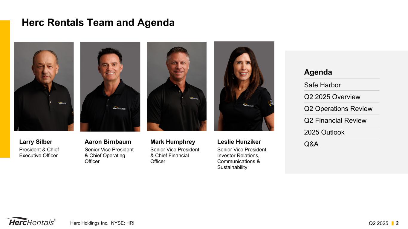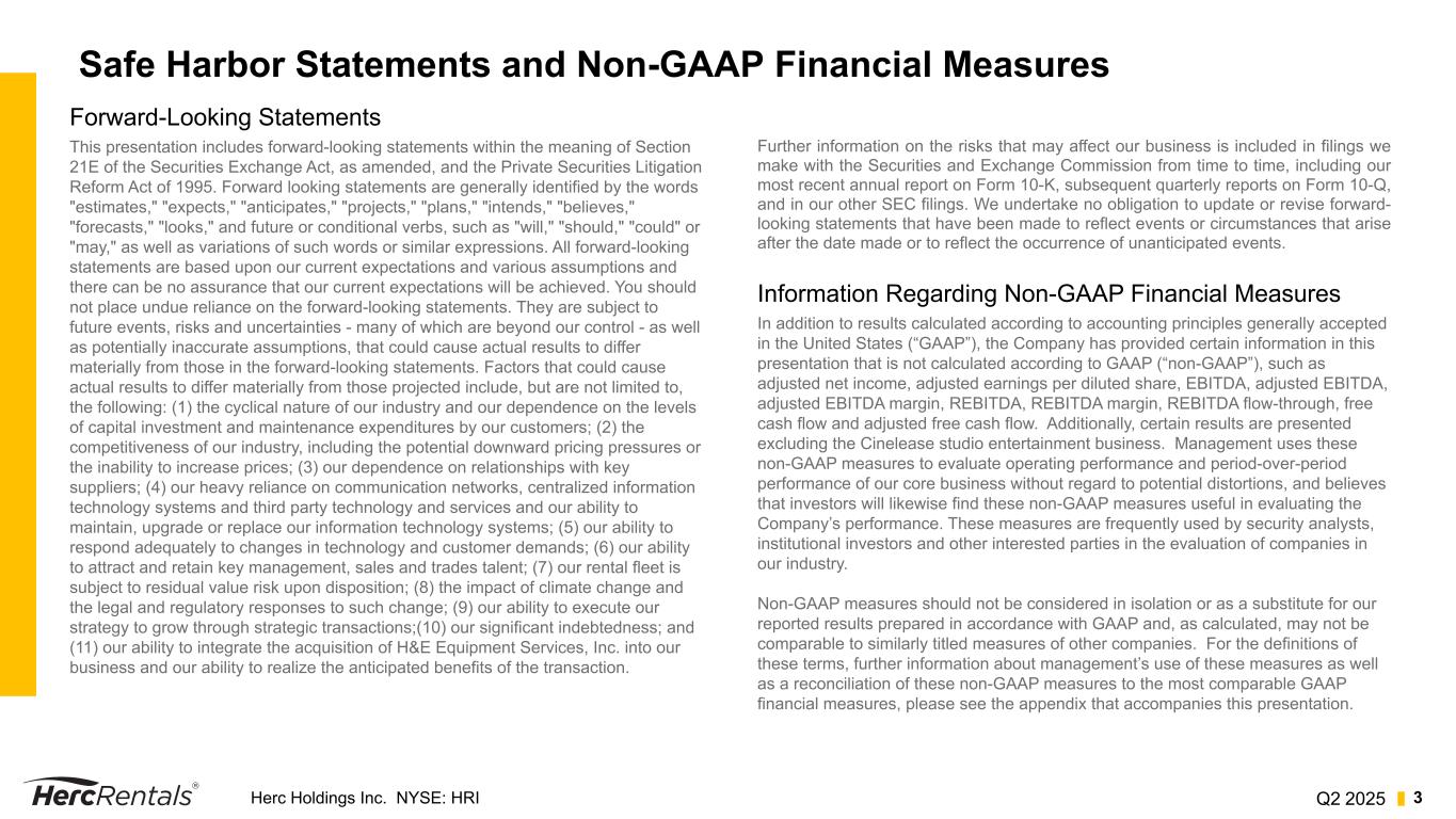 Q2 2025Herc Holdings Inc. NYSE: HRI 2 Herc Rentals Team and Agenda Agenda Safe Harbor Q2 2025 Overview Q2 Operations Review Q2 Financial Review 2025 Outlook Q&ALarry Silber President & Chief Executive Officer Aaron Birnbaum Senior Vice President & Chief Operating Officer Mark Humphrey Senior Vice President & Chief Financial Officer Leslie Hunziker Senior Vice President Investor Relations, Communications & Sustainability