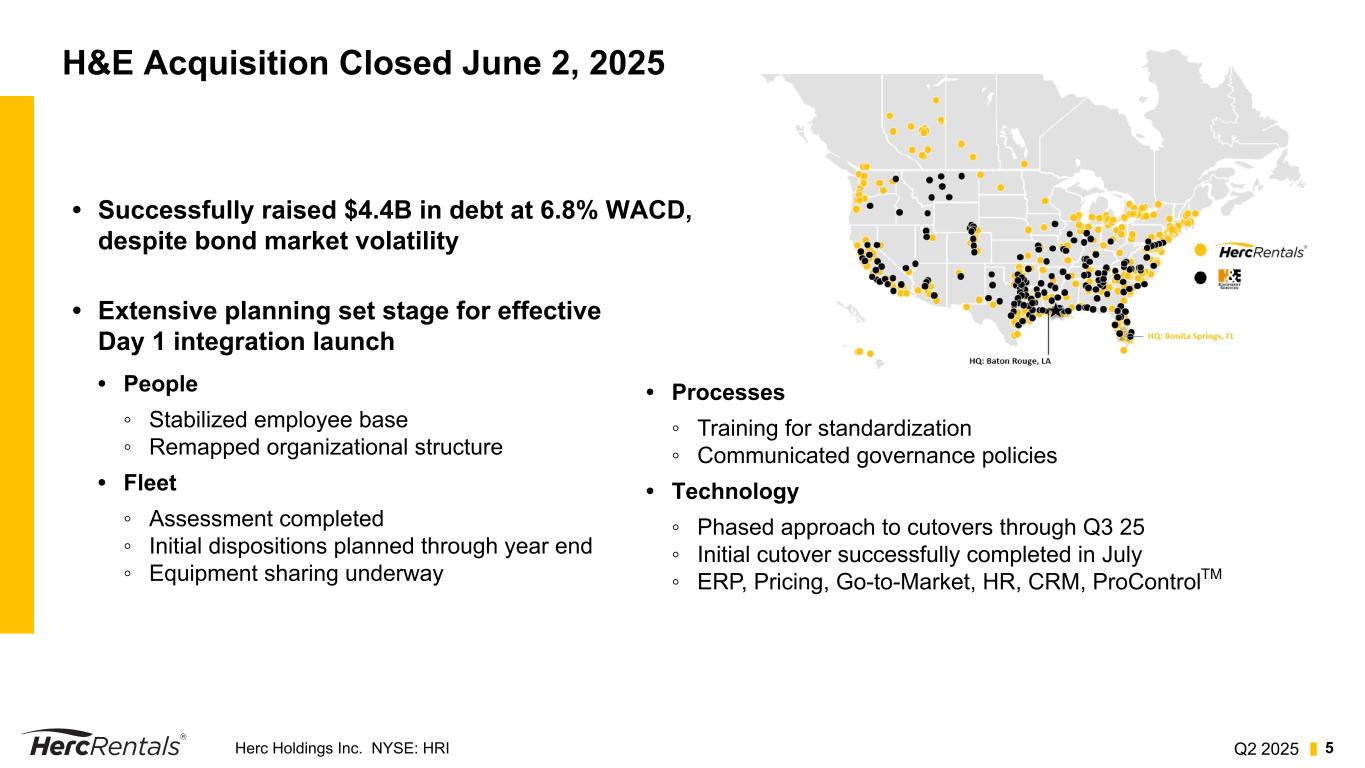 Q2 2025Herc Holdings Inc. NYSE: HRI 3 Safe Harbor Statements and Non-GAAP Financial Measures Forward-Looking Statements This presentation includes forward-looking statements within the meaning of Section 21E of the Securities Exchange Act, as amended, and the Private Securities Litigation Reform Act of 1995. Forward looking statements are generally identified by the words "estimates," "expects," "anticipates," "projects," "plans," "intends," "believes," "forecasts," "looks," and future or conditional verbs, such as "will," "should," "could" or "may," as well as variations of such words or similar expressions. All forward-looking statements are based upon our current expectations and various assumptions and there can be no assurance that our current expectations will be achieved. You should not place undue reliance on the forward-looking statements. They are subject to future events, risks and uncertainties - many of which are beyond our control - as well as potentially inaccurate assumptions, that could cause actual results to differ materially from those in the forward-looking statements. Factors that could cause actual results to differ materially from those projected include, but are not limited to, the following: (1) the cyclical nature of our industry and our dependence on the levels of capital investment and maintenance expenditures by our customers; (2) the competitiveness of our industry, including the potential downward pricing pressures or the inability to increase prices; (3) our dependence on relationships with key suppliers; (4) our heavy reliance on communication networks, centralized information technology systems and third party technology and services and our ability to maintain, upgrade or replace our information technology systems; (5) our ability to respond adequately to changes in technology and customer demands; (6) our ability to attract and retain key management, sales and trades talent; (7) our rental fleet is subject to residual value risk upon disposition; (8) the impact of climate change and the legal and regulatory responses to such change; (9) our ability to execute our strategy to grow through strategic transactions;(10) our significant indebtedness; and (11) our ability to integrate the acquisition of H&E Equipment Services, Inc. into our business and our ability to realize the anticipated benefits of the transaction. Further information on the risks that may affect our business is included in filings we make with the Securities and Exchange Commission from time to time, including our most recent annual report on Form 10-K, subsequent quarterly reports on Form 10-Q, and in our other SEC filings. We undertake no obligation to update or revise forward- looking statements that have been made to reflect events or circumstances that arise after the date made or to reflect the occurrence of unanticipated events. Information Regarding Non-GAAP Financial Measures In addition to results calculated according to accounting principles generally accepted in the United States (“GAAP”), the Company has provided certain information in this presentation that is not calculated according to GAAP (“non-GAAP”), such as adjusted net income, adjusted earnings per diluted share, EBITDA, adjusted EBITDA, adjusted EBITDA margin, REBITDA, REBITDA margin, REBITDA flow-through, free cash flow and adjusted free cash flow. Additionally, certain results are presented excluding the Cinelease studio entertainment business. Management uses these non-GAAP measures to evaluate operating performance and period-over-period performance of our core business without regard to potential distortions, and believes that investors will likewise find these non-GAAP measures useful in evaluating the Company’s performance. These measures are frequently used by security analysts, institutional investors and other interested parties in the evaluation of companies in our industry. Non-GAAP measures should not be considered in isolation or as a substitute for our reported results prepared in accordance with GAAP and, as calculated, may not be comparable to similarly titled measures of other companies. For the definitions of these terms, further information about management’s use of these measures as well as a reconciliation of these non-GAAP measures to the most comparable GAAP financial measures, please see the appendix that accompanies this presentation.