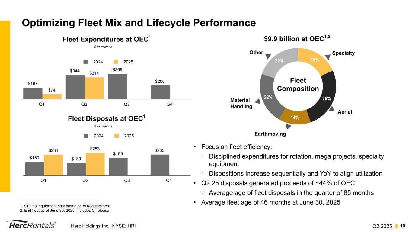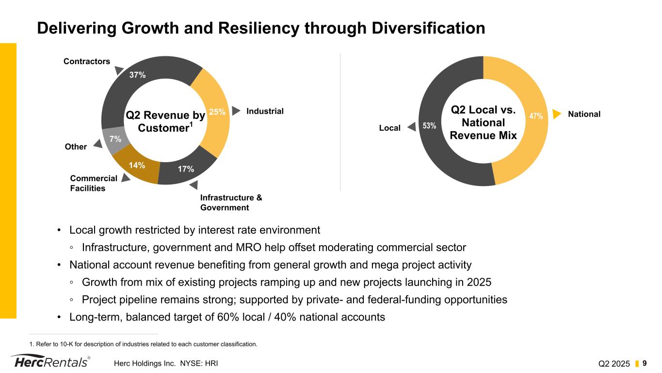 Q2 2025Herc Holdings Inc. NYSE: HRI 9 Delivering Growth and Resiliency through Diversification Q2 Local vs. National Revenue Mix 47% 53% NationalQ2 Revenue by Customer1 37% 25% 17%14% 7% Local Commercial Facilities Contractors Infrastructure & Government Other Industrial • Local growth restricted by interest rate environment ◦ Infrastructure, government and MRO help offset moderating commercial sector • National account revenue benefiting from general growth and mega project activity ◦ Growth from mix of existing projects ramping up and new projects launching in 2025 ◦ Project pipeline remains strong; supported by private- and federal-funding opportunities • Long-term, balanced target of 60% local / 40% national accounts 1. Refer to 10-K for description of industries related to each customer classification.