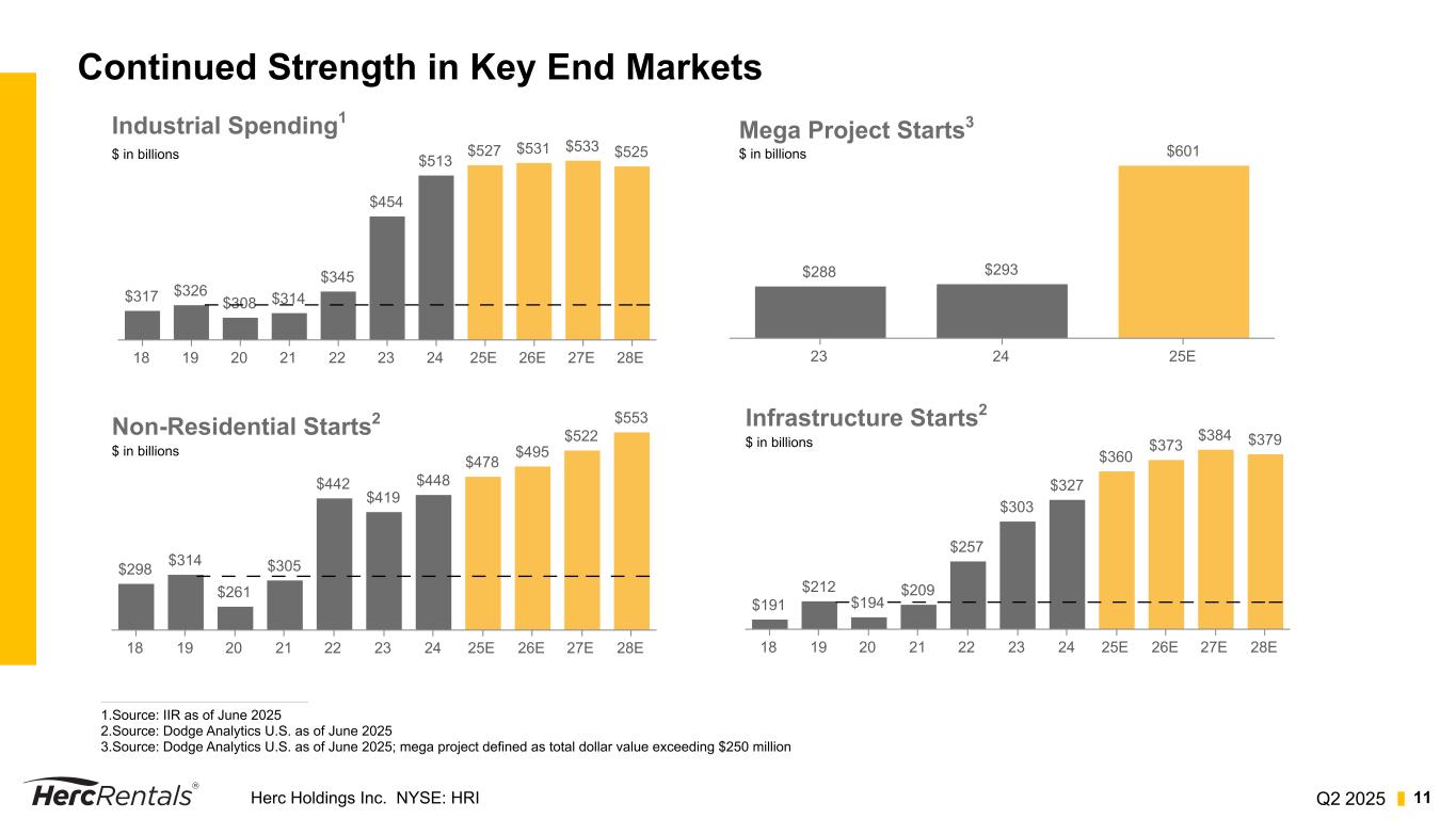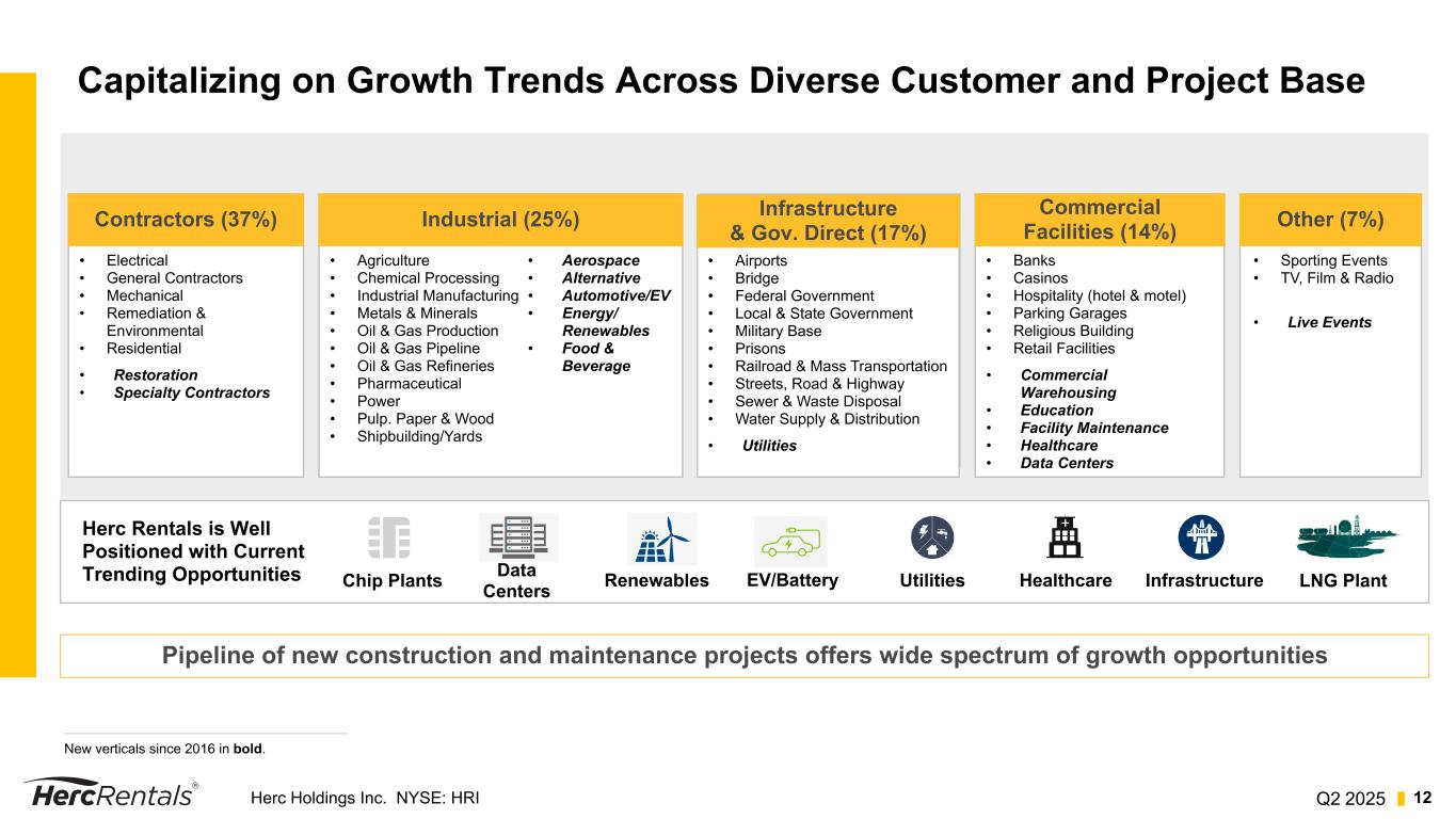 Q2 2025Herc Holdings Inc. NYSE: HRI 11 Continued Strength in Key End Markets 1.Source: IIR as of June 2025 2.Source: Dodge Analytics U.S. as of June 2025 3.Source: Dodge Analytics U.S. as of June 2025; mega project defined as total dollar value exceeding $250 million Industrial Spending1 $317 $326 $308 $314 $345 $454 $513 $527 $531 $533 $525 18 19 20 21 22 23 24 25E 26E 27E 28E $ in billions Non-Residential Starts2 $298 $314 $261 $305 $442 $419 $448 $478 $495 $522 $553 18 19 20 21 22 23 24 25E 26E 27E 28E $ in billions — — — — — — — — — — — — — — — — — — — — — — — — — — — — — — — — — — — — — — Infrastructure Starts2 $191 $212 $194 $209 $257 $303 $327 $360 $373 $384 $379 18 19 20 21 22 23 24 25E 26E 27E 28E $ in billions — — — — — — — — — — — — — — — — — — Mega Project Starts3 $288 $293 $601 23 24 25E $ in billions