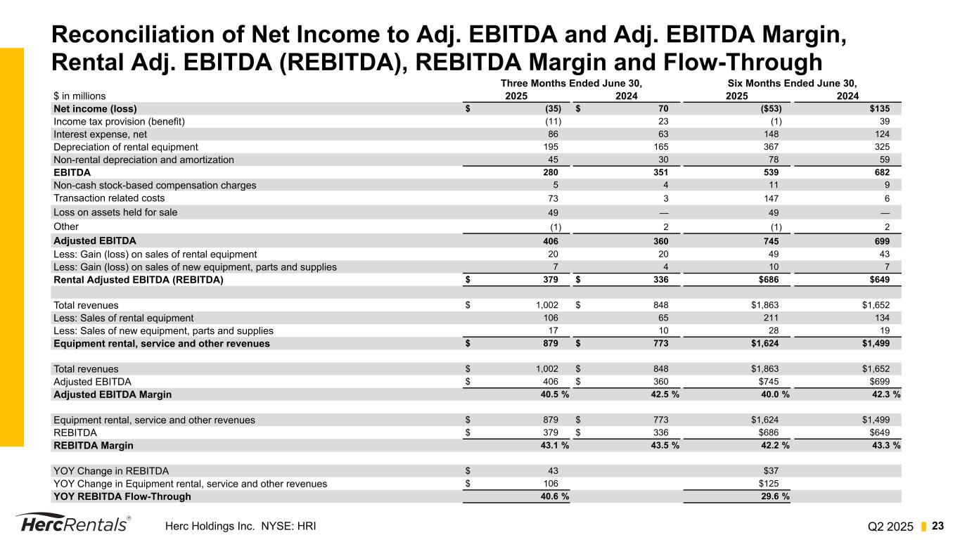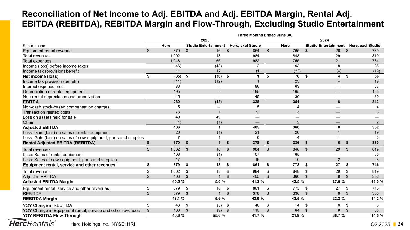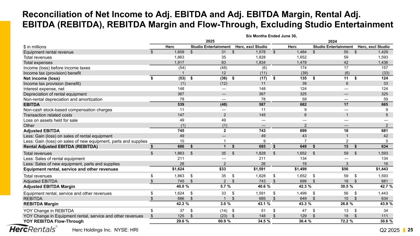 Q2 2025Herc Holdings Inc. NYSE: HRI 24 Reconciliation of Net Income to Adj. EBITDA and Adj. EBITDA Margin, Rental Adj. EBITDA (REBITDA), REBITDA Margin and Flow-Through, Excluding Studio Entertainment Three Months Ended June 30, 2025 2024 $ in millions Herc Studio Entertainment Herc, excl Studio Herc Studio Entertainment Herc, excl Studio Equipment rental revenue $ 870 $ 16 $ 854 $ 765 $ 26 $ 739 Total revenues 1,002 18 984 848 29 819 Total expenses 1,048 66 982 755 21 734 Income (loss) before income taxes (46) (48) 2 93 8 85 Income tax (provision) benefit 11 12 (1) (23) (4) (19) Net income (loss) $ (35) $ (36) $ 1 $ 70 $ 4 $ 66 Income tax provision (benefit) (11) (12) 1 23 4 19 Interest expense, net 86 — 86 63 — 63 Depreciation of rental equipment 195 — 195 165 — 165 Non-rental depreciation and amortization 45 — 45 30 — 30 EBITDA 280 (48) 328 351 8 343 Non-cash stock-based compensation charges 5 — 5 4 — 4 Transaction related costs 73 1 72 3 — 3 Loss on assets held for sale 49 49 — — — — Other (1) (1) — 2 — 2 Adjusted EBITDA 406 1 405 360 8 352 Less: Gain (loss) on sales of rental equipment 20 (1) 21 20 1 19 Less: Gain (loss) on sales of new equipment, parts and supplies 7 1 6 4 1 3 Rental Adjusted EBITDA (REBITDA) $ 379 $ 1 $ 378 $ 336 $ 6 $ 330 Total revenues $ 1,002 $ 18 $ 984 $ 848 $ 29 $ 819 Less: Sales of rental equipment 106 (1) 107 65 — 65 Less: Sales of new equipment, parts and supplies 17 1 16 10 2 8 Equipment rental, service and other revenues $ 879 $ 18 $ 861 $ 773 $ 27 $ 746 Total revenues $ 1,002 $ 18 $ 984 $ 848 $ 29 $ 819 Adjusted EBITDA $ 406 $ 1 $ 405 $ 360 $ 8 $ 352 Adjusted EBITDA Margin 40.5 % 5.6 % 41.2 % 42.5 % 27.6 % 43.0 % Equipment rental, service and other revenues $ 879 $ 18 $ 861 $ 773 $ 27 $ 746 REBITDA $ 379 $ 1 $ 378 $ 336 $ 6 $ 330 REBITDA Margin 43.1 % 5.6 % 43.9 % 43.5 % 22.2 % 44.2 % YOY Change in REBITDA $ 43 $ (5) $ 48 $ 14 $ 6 $ 8 YOY Change in Equipment rental, service and other revenues $ 106 $ (9) $ 115 $ 64 $ 9 $ 55 YOY REBITDA Flow-Through 40.6 % 55.6 % 41.7 % 21.9 % 66.7 % 14.5 %