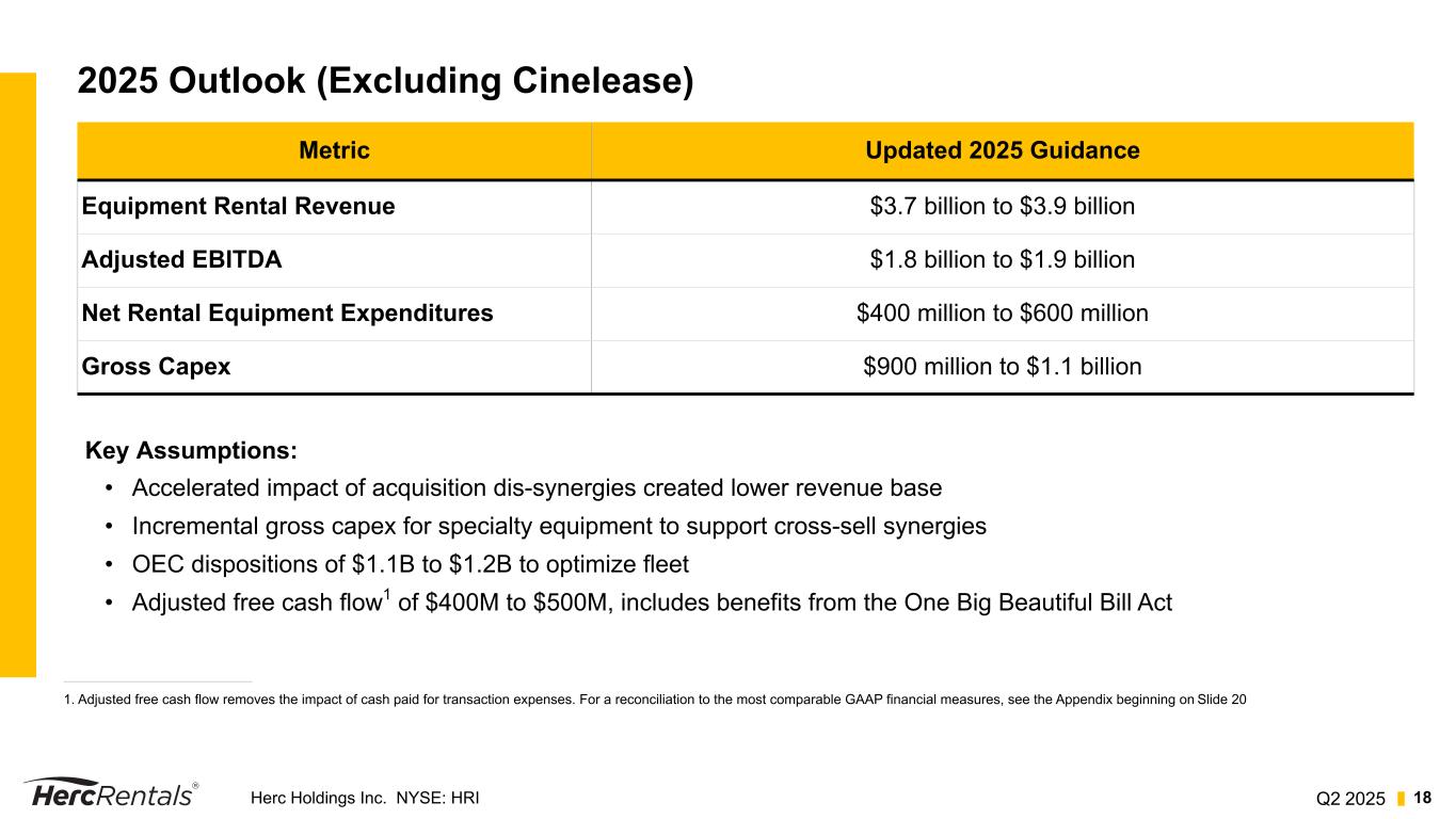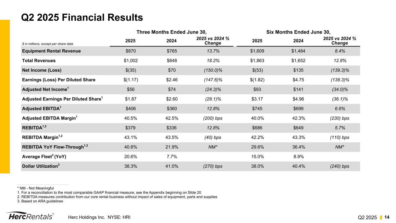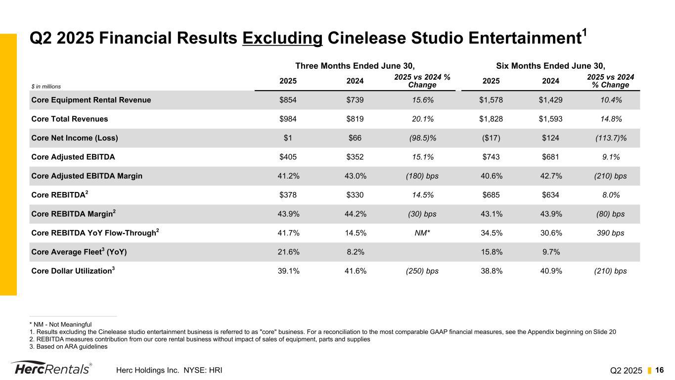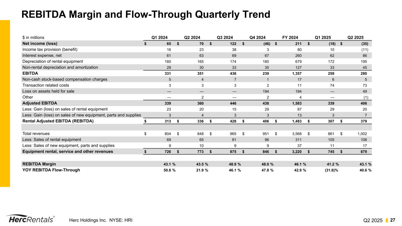 Q2 2025Herc Holdings Inc. NYSE: HRI 24 Reconciliation of Net Income to Adj. EBITDA and Adj. EBITDA Margin, Rental Adj. EBITDA (REBITDA), REBITDA Margin and Flow-Through, Excluding Studio Entertainment Three Months Ended June 30, 2025 2024 $ in millions Herc Studio Entertainment Herc, excl Studio Herc Studio Entertainment Herc, excl Studio Equipment rental revenue $ 870 $ 16 $ 854 $ 765 $ 26 $ 739 Total revenues 1,002 18 984 848 29 819 Total expenses 1,048 66 982 755 21 734 Income (loss) before income taxes (46) (48) 2 93 8 85 Income tax (provision) benefit 11 12 (1) (23) (4) (19) Net income (loss) $ (35) $ (36) $ 1 $ 70 $ 4 $ 66 Income tax provision (benefit) (11) (12) 1 23 4 19 Interest expense, net 86 — 86 63 — 63 Depreciation of rental equipment 195 — 195 165 — 165 Non-rental depreciation and amortization 45 — 45 30 — 30 EBITDA 280 (48) 328 351 8 343 Non-cash stock-based compensation charges 5 — 5 4 — 4 Transaction related costs 73 1 72 3 — 3 Loss on assets held for sale 49 49 — — — — Other (1) (1) — 2 — 2 Adjusted EBITDA 406 1 405 360 8 352 Less: Gain (loss) on sales of rental equipment 20 (1) 21 20 1 19 Less: Gain (loss) on sales of new equipment, parts and supplies 7 1 6 4 1 3 Rental Adjusted EBITDA (REBITDA) $ 379 $ 1 $ 378 $ 336 $ 6 $ 330 Total revenues $ 1,002 $ 18 $ 984 $ 848 $ 29 $ 819 Less: Sales of rental equipment 106 (1) 107 65 — 65 Less: Sales of new equipment, parts and supplies 17 1 16 10 2 8 Equipment rental, service and other revenues $ 879 $ 18 $ 861 $ 773 $ 27 $ 746 Total revenues $ 1,002 $ 18 $ 984 $ 848 $ 29 $ 819 Adjusted EBITDA $ 406 $ 1 $ 405 $ 360 $ 8 $ 352 Adjusted EBITDA Margin 40.5 % 5.6 % 41.2 % 42.5 % 27.6 % 43.0 % Equipment rental, service and other revenues $ 879 $ 18 $ 861 $ 773 $ 27 $ 746 REBITDA $ 379 $ 1 $ 378 $ 336 $ 6 $ 330 REBITDA Margin 43.1 % 5.6 % 43.9 % 43.5 % 22.2 % 44.2 % YOY Change in REBITDA $ 43 $ (5) $ 48 $ 14 $ 6 $ 8 YOY Change in Equipment rental, service and other revenues $ 106 $ (9) $ 115 $ 64 $ 9 $ 55 YOY REBITDA Flow-Through 40.6 % 55.6 % 41.7 % 21.9 % 66.7 % 14.5 %