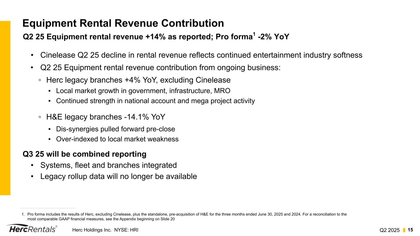 Q2 2025Herc Holdings Inc. NYSE: HRI 14 Q2 2025 Financial Results * NM - Not Meaningful 1. For a reconciliation to the most comparable GAAP financial measure, see the Appendix beginning on Slide 20 2. REBITDA measures contribution from our core rental business without impact of sales of equipment, parts and supplies 3. Based on ARA guidelines Three Months Ended June 30, Six Months Ended June 30, $ in millions, except per share data 2025 2024 2025 vs 2024 % Change 2025 2024 2025 vs 2024 % Change Equipment Rental Revenue $870 $765 13.7% $1,609 $1,484 8.4% Total Revenues $1,002 $848 18.2% $1,863 $1,652 12.8% Net Income (Loss) $(35) $70 (150.0)% $(53) $135 (139.3)% Earnings (Loss) Per Diluted Share $(1.17) $2.46 (147.6)% $(1.82) $4.75 (138.3)% Adjusted Net Income1 $56 $74 (24.3)% $93 $141 (34.0)% Adjusted Earnings Per Diluted Share1 $1.87 $2.60 (28.1)% $3.17 $4.96 (36.1)% Adjusted EBITDA1 $406 $360 12.8% $745 $699 6.6% Adjusted EBITDA Margin1 40.5% 42.5% (200) bps 40.0% 42.3% (230) bps REBITDA1,2 $379 $336 12.8% $686 $649 5.7% REBITDA Margin1,2 43.1% 43.5% (40) bps 42.2% 43.3% (110) bps REBITDA YoY Flow-Through1,2 40.6% 21.9% NM* 29.6% 36.4% NM* Average Fleet3 (YoY) 20.6% 7.7% 15.0% 8.9% Dollar Utilization3 38.3% 41.0% (270) bps 38.0% 40.4% (240) bps