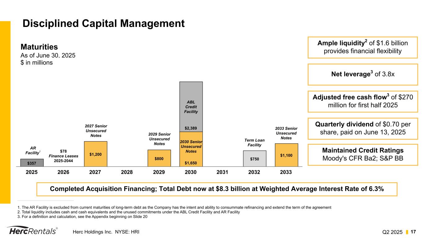 Q2 2025Herc Holdings Inc. NYSE: HRI 16 Q2 2025 Financial Results Excluding Cinelease Studio Entertainment1 * NM - Not Meaningful 1. Results excluding the Cinelease studio entertainment business is referred to as "core" business. For a reconciliation to the most comparable GAAP financial measures, see the Appendix beginning on Slide 20 2. REBITDA measures contribution from our core rental business without impact of sales of equipment, parts and supplies 3. Based on ARA guidelines Three Months Ended June 30, Six Months Ended June 30, $ in millions 2025 2024 2025 vs 2024 % Change 2025 2024 2025 vs 2024 % Change Core Equipment Rental Revenue $854 $739 15.6% $1,578 $1,429 10.4% Core Total Revenues $984 $819 20.1% $1,828 $1,593 14.8% Core Net Income (Loss) $1 $66 (98.5)% ($17) $124 (113.7)% Core Adjusted EBITDA $405 $352 15.1% $743 $681 9.1% Core Adjusted EBITDA Margin 41.2% 43.0% (180) bps 40.6% 42.7% (210) bps Core REBITDA2 $378 $330 14.5% $685 $634 8.0% Core REBITDA Margin2 43.9% 44.2% (30) bps 43.1% 43.9% (80) bps Core REBITDA YoY Flow-Through2 41.7% 14.5% NM* 34.5% 30.6% 390 bps Core Average Fleet3 (YoY) 21.6% 8.2% 15.8% 9.7% Core Dollar Utilization3 39.1% 41.6% (250) bps 38.8% 40.9% (210) bps