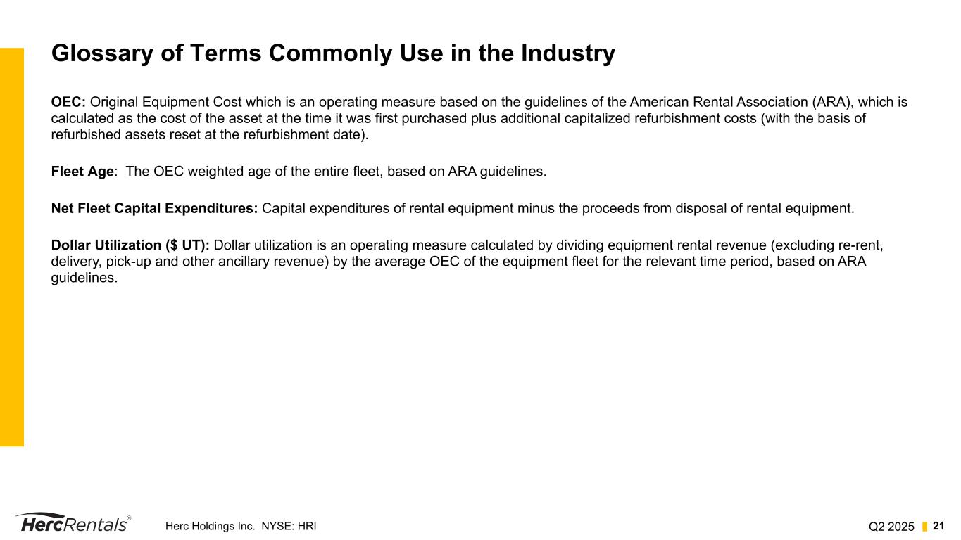 Q2 2025Herc Holdings Inc. NYSE: HRI 21 Glossary of Terms Commonly Use in the Industry OEC: Original Equipment Cost which is an operating measure based on the guidelines of the American Rental Association (ARA), which is calculated as the cost of the asset at the time it was first purchased plus additional capitalized refurbishment costs (with the basis of refurbished assets reset at the refurbishment date). Fleet Age: The OEC weighted age of the entire fleet, based on ARA guidelines. Net Fleet Capital Expenditures: Capital expenditures of rental equipment minus the proceeds from disposal of rental equipment. Dollar Utilization ($ UT): Dollar utilization is an operating measure calculated by dividing equipment rental revenue (excluding re-rent, delivery, pick-up and other ancillary revenue) by the average OEC of the equipment fleet for the relevant time period, based on ARA guidelines.