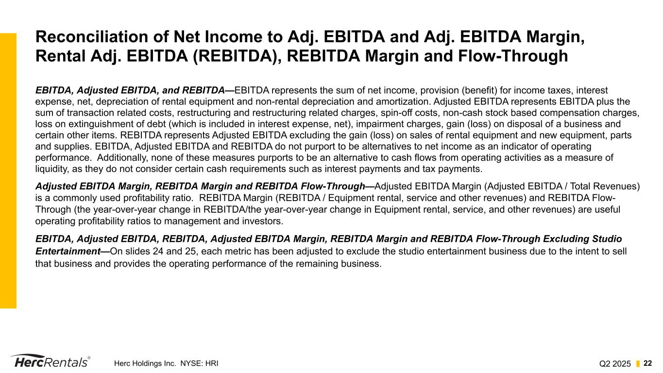 Q2 2025Herc Holdings Inc. NYSE: HRI 22 Reconciliation of Net Income to Adj. EBITDA and Adj. EBITDA Margin, Rental Adj. EBITDA (REBITDA), REBITDA Margin and Flow-Through EBITDA, Adjusted EBITDA, and REBITDA—EBITDA represents the sum of net income, provision (benefit) for income taxes, interest expense, net, depreciation of rental equipment and non-rental depreciation and amortization. Adjusted EBITDA represents EBITDA plus the sum of transaction related costs, restructuring and restructuring related charges, spin-off costs, non-cash stock based compensation charges, loss on extinguishment of debt (which is included in interest expense, net), impairment charges, gain (loss) on disposal of a business and certain other items. REBITDA represents Adjusted EBITDA excluding the gain (loss) on sales of rental equipment and new equipment, parts and supplies. EBITDA, Adjusted EBITDA and REBITDA do not purport to be alternatives to net income as an indicator of operating performance. Additionally, none of these measures purports to be an alternative to cash flows from operating activities as a measure of liquidity, as they do not consider certain cash requirements such as interest payments and tax payments. Adjusted EBITDA Margin, REBITDA Margin and REBITDA Flow-Through—Adjusted EBITDA Margin (Adjusted EBITDA / Total Revenues) is a commonly used profitability ratio. REBITDA Margin (REBITDA / Equipment rental, service and other revenues) and REBITDA Flow- Through (the year-over-year change in REBITDA/the year-over-year change in Equipment rental, service, and other revenues) are useful operating profitability ratios to management and investors. EBITDA, Adjusted EBITDA, REBITDA, Adjusted EBITDA Margin, REBITDA Margin and REBITDA Flow-Through Excluding Studio Entertainment—On slides 24 and 25, each metric has been adjusted to exclude the studio entertainment business due to the intent to sell that business and provides the operating performance of the remaining business.