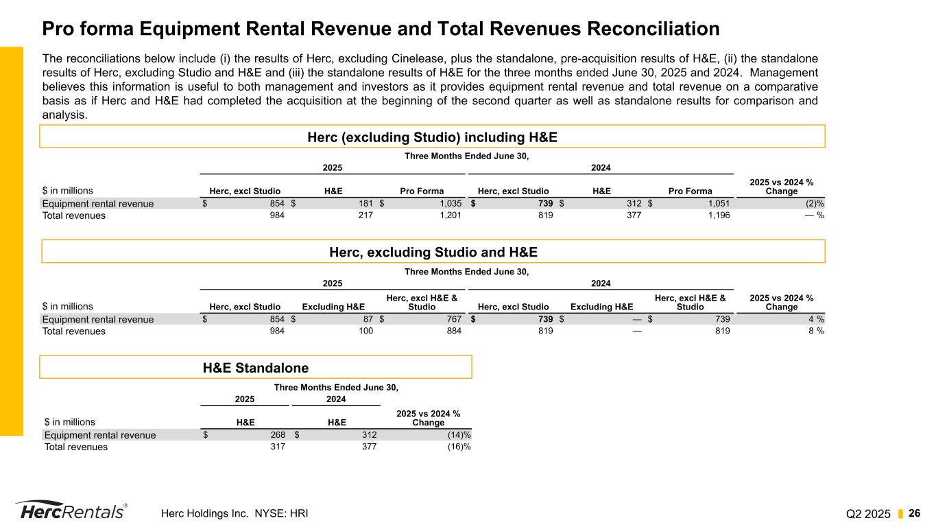 Q2 2025Herc Holdings Inc. NYSE: HRI 25 Reconciliation of Net Income to Adj. EBITDA and Adj. EBITDA Margin, Rental Adj. EBITDA (REBITDA), REBITDA Margin and Flow-Through, Excluding Studio Entertainment Six Months Ended June 30, 2025 2024 $ in millions Herc Studio Entertainment Herc, excl Studio Herc Studio Entertainment Herc, excl Studio Equipment rental revenue $ 1,609 $ 31 $ 1,578 $ 1,484 $ 55 $ 1,429 Total revenues 1,863 35 1,828 1,652 59 1,593 Total expenses 1,917 83 1,834 1,478 42 1,436 Income (loss) before income taxes (54) (48) (6) 174 17 157 Income tax (provision) benefit 1 12 (11) (39) (6) (33) Net income (loss) $ (53) $ (36) $ (17) $ 135 $ 11 $ 124 Income tax provision (benefit) (1) (12) 11 39 6 33 Interest expense, net 148 — 148 124 — 124 Depreciation of rental equipment 367 — 367 325 — 325 Non-rental depreciation and amortization 78 — 78 59 — 59 EBITDA 539 (48) 587 682 17 665 Non-cash stock-based compensation charges 11 — 11 9 — 9 Transaction related costs 147 2 145 6 1 5 Loss on assets held for sale 49 49 — — — — Other (1) (1) — 2 — 2 Adjusted EBITDA 745 2 743 699 18 681 Less: Gain (loss) on sales of rental equipment 49 — 49 43 1 42 Less: Gain (loss) on sales of new equipment, parts and supplies 10 1 9 7 2 5 Rental Adjusted EBITDA (REBITDA) $ 686 $ 1 $ 685 $ 649 $ 15 $ 634 Total revenues $ 1,863 $ 35 $ 1,828 $ 1,652 $ 59 $ 1,593 Less: Sales of rental equipment 211 — 211 134 — 134 Less: Sales of new equipment, parts and supplies 28 2 26 19 3 16 Equipment rental, service and other revenues $1,624 $33 $1,591 $1,499 $56 $1,443 Total revenues $ 1,863 $ 35 $ 1,828 $ 1,652 $ 59 $ 1,593 Adjusted EBITDA $ 745 $ 2 $ 743 $ 699 $ 18 $ 681 Adjusted EBITDA Margin 40.0 % 5.7 % 40.6 % 42.3 % 30.5 % 42.7 % Equipment rental, service and other revenues $ 1,624 $ 33 $ 1,591 $ 1,499 $ 56 $ 1,443 REBITDA $ 686 $ 1 $ 685 $ 649 $ 15 $ 634 REBITDA Margin 42.2 % 3.0 % 43.1 % 43.3 % 26.8 % 43.9 % YOY Change in REBITDA $ 37 $ (14) $ 51 $ 47 $ 13 $ 34 YOY Change in Equipment rental, service and other revenues $ 125 $ (23) $ 148 $ 129 $ 18 $ 111 YOY REBITDA Flow-Through 29.6 % 60.9 % 34.5 % 36.4 % 72.2 % 30.6 %