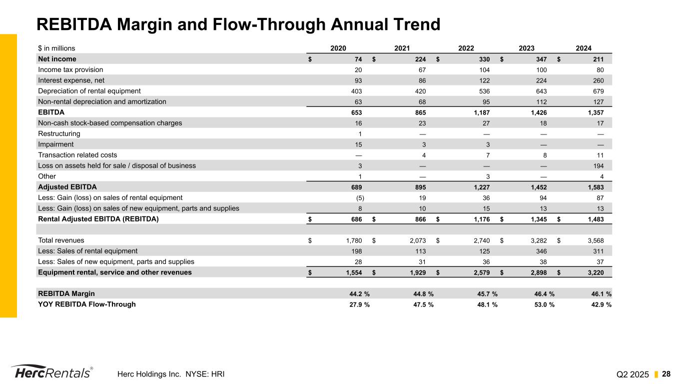 Q2 2025Herc Holdings Inc. NYSE: HRI 27 REBITDA Margin and Flow-Through Quarterly Trend $ in millions Q1 2024 Q2 2024 Q3 2024 Q4 2024 FY 2024 Q1 2025 Q2 2025 Net income (loss) $ 65 $ 70 $ 122 $ (46) $ 211 $ (18) $ (35) Income tax provision (benefit) 16 23 38 3 80 10 (11) Interest expense, net 61 63 69 67 260 62 86 Depreciation of rental equipment 160 165 174 180 679 172 195 Non-rental depreciation and amortization 29 30 33 35 127 33 45 EBITDA 331 351 436 239 1,357 259 280 Non-cash stock-based compensation charges 5 4 7 1 17 6 5 Transaction related costs 3 3 3 2 11 74 73 Loss on assets held for sale — — — 194 194 — 49 Other — 2 — 2 4 — (1) Adjusted EBITDA 339 360 446 438 1,583 339 406 Less: Gain (loss) on sales of rental equipment 23 20 15 29 87 29 20 Less: Gain (loss) on sales of new equipment, parts and supplies 3 4 3 3 13 3 7 Rental Adjusted EBITDA (REBITDA) $ 313 $ 336 $ 428 $ 406 $ 1,483 $ 307 $ 379 Total revenues $ 804 $ 848 $ 965 $ 951 $ 3,568 $ 861 $ 1,002 Less: Sales of rental equipment 69 65 81 96 311 105 106 Less: Sales of new equipment, parts and supplies 9 10 9 9 37 11 17 Equipment rental, service and other revenues $ 726 $ 773 $ 875 $ 846 $ 3,220 $ 745 $ 879 REBITDA Margin 43.1 % 43.5 % 48.9 % 48.0 % 46.1 % 41.2 % 43.1 % YOY REBITDA Flow-Through 50.8 % 21.9 % 46.1 % 47.8 % 42.9 % (31.6)% 40.6 %