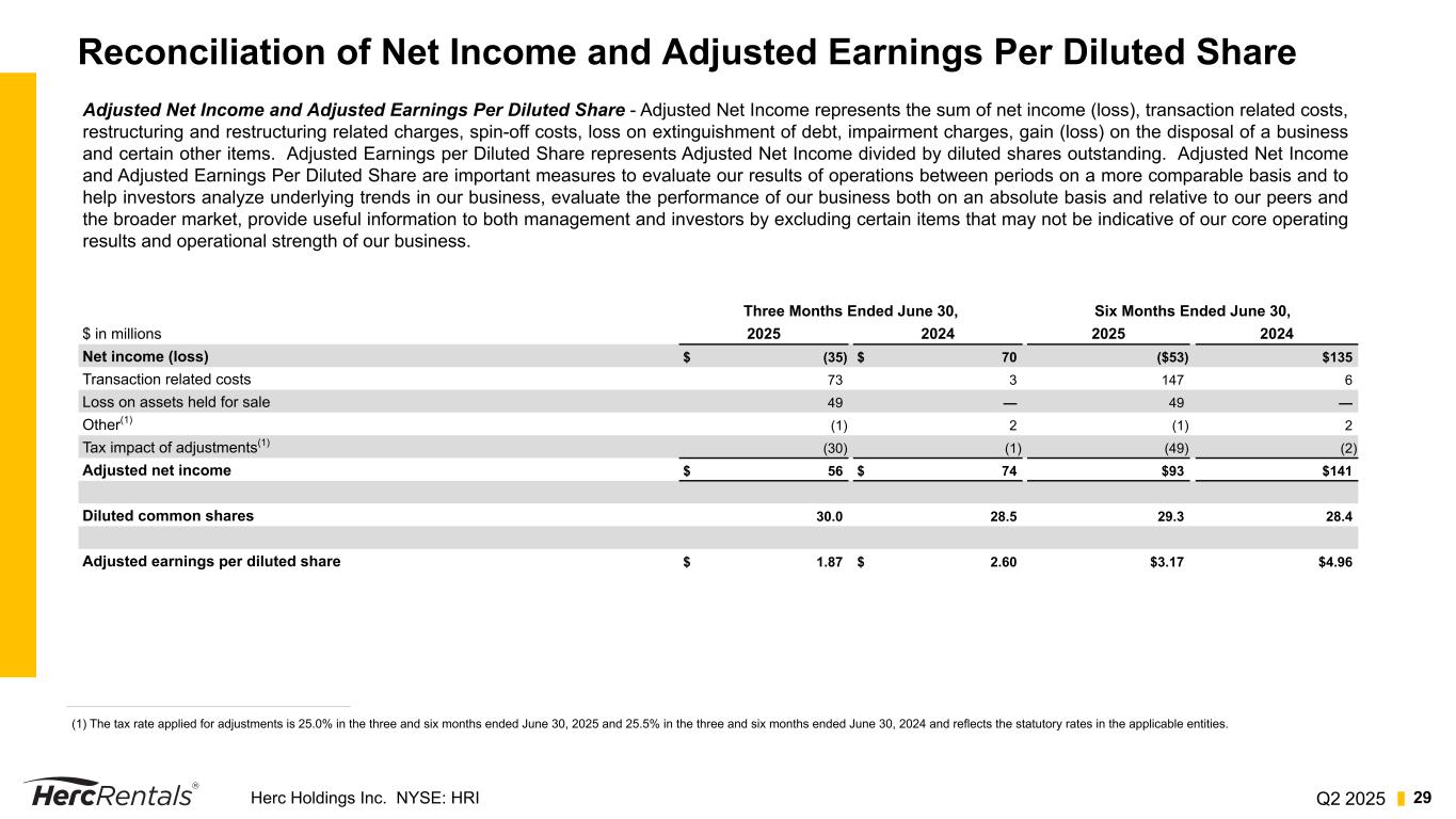 Q2 2025Herc Holdings Inc. NYSE: HRI 29 Reconciliation of Net Income and Adjusted Earnings Per Diluted Share Three Months Ended June 30, Six Months Ended June 30, $ in millions 2025 2024 2025 2024 Net income (loss) $ (35) $ 70 ($53) $135 Transaction related costs 73 3 147 6 Loss on assets held for sale 49 — 49 — Other(1) (1) 2 (1) 2 Tax impact of adjustments(1) (30) (1) (49) (2) Adjusted net income $ 56 $ 74 $93 $141 Diluted common shares 30.0 28.5 29.3 28.4 Adjusted earnings per diluted share $ 1.87 $ 2.60 $3.17 $4.96 Adjusted Net Income and Adjusted Earnings Per Diluted Share - Adjusted Net Income represents the sum of net income (loss), transaction related costs, restructuring and restructuring related charges, spin-off costs, loss on extinguishment of debt, impairment charges, gain (loss) on the disposal of a business and certain other items. Adjusted Earnings per Diluted Share represents Adjusted Net Income divided by diluted shares outstanding. Adjusted Net Income and Adjusted Earnings Per Diluted Share are important measures to evaluate our results of operations between periods on a more comparable basis and to help investors analyze underlying trends in our business, evaluate the performance of our business both on an absolute basis and relative to our peers and the broader market, provide useful information to both management and investors by excluding certain items that may not be indicative of our core operating results and operational strength of our business. (1) The tax rate applied for adjustments is 25.0% in the three and six months ended June 30, 2025 and 25.5% in the three and six months ended June 30, 2024 and reflects the statutory rates in the applicable entities.