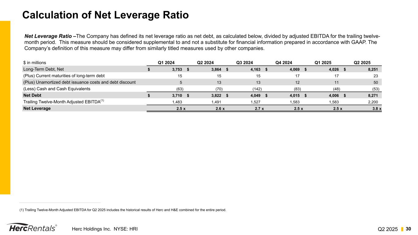 Q2 2025Herc Holdings Inc. NYSE: HRI 30 Calculation of Net Leverage Ratio $ in millions Q1 2024 Q2 2024 Q3 2024 Q4 2024 Q1 2025 Q2 2025 Long-Term Debt, Net $ 3,753 $ 3,864 $ 4,163 $ 4,069 $ 4,026 $ 8,251 (Plus) Current maturities of long-term debt 15 15 15 17 17 23 (Plus) Unamortized debt issuance costs and debt discount 5 13 13 12 11 50 (Less) Cash and Cash Equivalents (63) (70) (142) (83) (48) (53) Net Debt $ 3,710 $ 3,822 $ 4,049 $ 4,015 $ 4,006 $ 8,271 Trailing Twelve-Month Adjusted EBITDA(1) 1,483 1,491 1,527 1,583 1,583 2,200 Net Leverage 2.5 x 2.6 x 2.7 x 2.5 x 2.5 x 3.8 x Net Leverage Ratio –The Company has defined its net leverage ratio as net debt, as calculated below, divided by adjusted EBITDA for the trailing twelve- month period. This measure should be considered supplemental to and not a substitute for financial information prepared in accordance with GAAP. The Company’s definition of this measure may differ from similarly titled measures used by other companies. (1) Trailing Twelve-Month Adjusted EBITDA for Q2 2025 includes the historical results of Herc and H&E combined for the entire period.