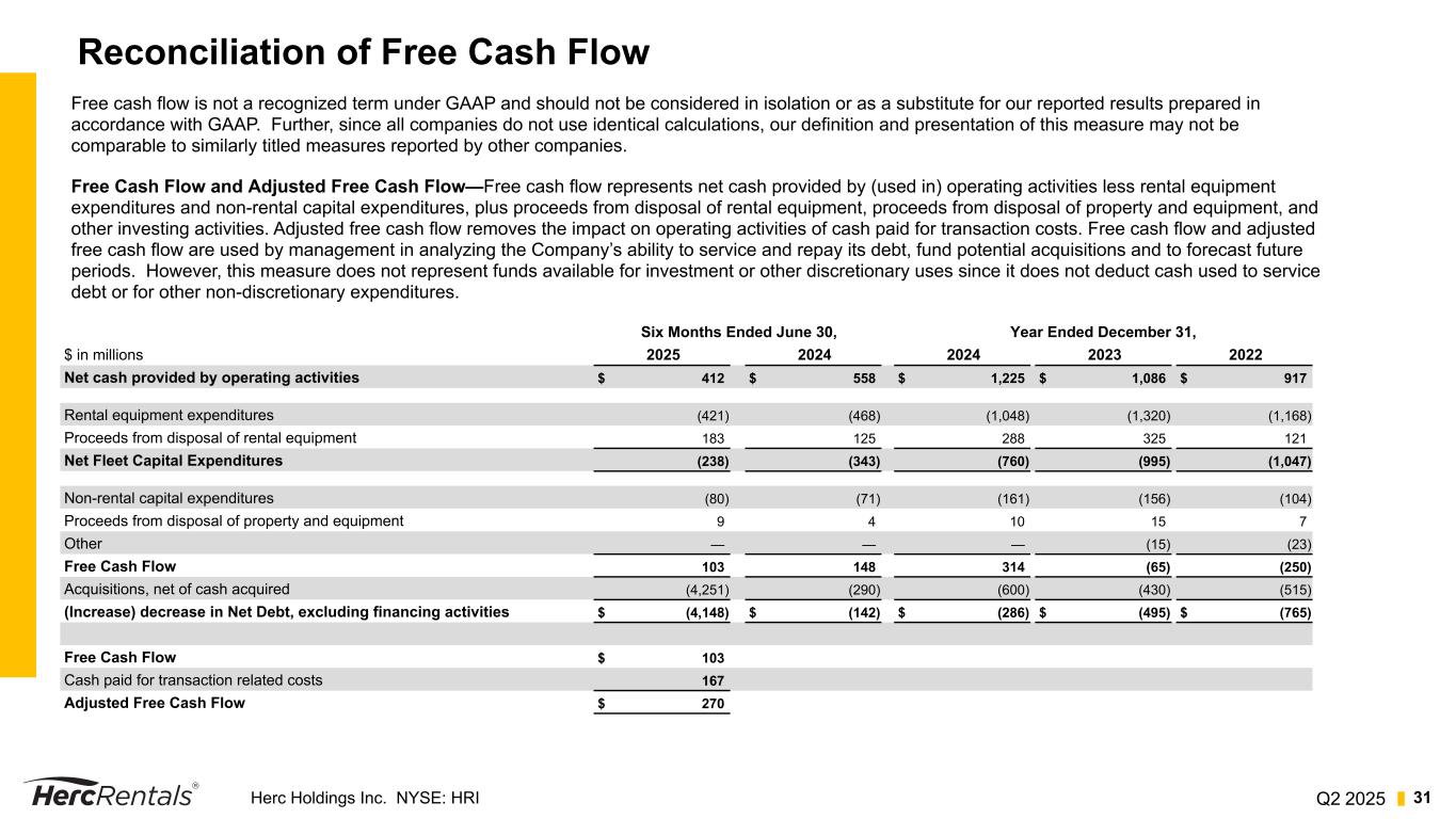 Q2 2025Herc Holdings Inc. NYSE: HRI 31 Reconciliation of Free Cash Flow Six Months Ended June 30, Year Ended December 31, $ in millions 2025 2024 2024 2023 2022 Net cash provided by operating activities $ 412 $ 558 $ 1,225 $ 1,086 $ 917 Rental equipment expenditures (421) (468) (1,048) (1,320) (1,168) Proceeds from disposal of rental equipment 183 125 288 325 121 Net Fleet Capital Expenditures (238) (343) (760) (995) (1,047) Non-rental capital expenditures (80) (71) (161) (156) (104) Proceeds from disposal of property and equipment 9 4 10 15 7 Other — — — (15) (23) Free Cash Flow 103 148 314 (65) (250) Acquisitions, net of cash acquired (4,251) (290) (600) (430) (515) (Increase) decrease in Net Debt, excluding financing activities $ (4,148) $ (142) $ (286) $ (495) $ (765) Free Cash Flow $ 103 Cash paid for transaction related costs 167 Adjusted Free Cash Flow $ 270 Free cash flow is not a recognized term under GAAP and should not be considered in isolation or as a substitute for our reported results prepared in accordance with GAAP. Further, since all companies do not use identical calculations, our definition and presentation of this measure may not be comparable to similarly titled measures reported by other companies. Free Cash Flow and Adjusted Free Cash Flow—Free cash flow represents net cash provided by (used in) operating activities less rental equipment expenditures and non-rental capital expenditures, plus proceeds from disposal of rental equipment, proceeds from disposal of property and equipment, and other investing activities. Adjusted free cash flow removes the impact on operating activities of cash paid for transaction costs. Free cash flow and adjusted free cash flow are used by management in analyzing the Company’s ability to service and repay its debt, fund potential acquisitions and to forecast future periods. However, this measure does not represent funds available for investment or other discretionary uses since it does not deduct cash used to service debt or for other non-discretionary expenditures.
