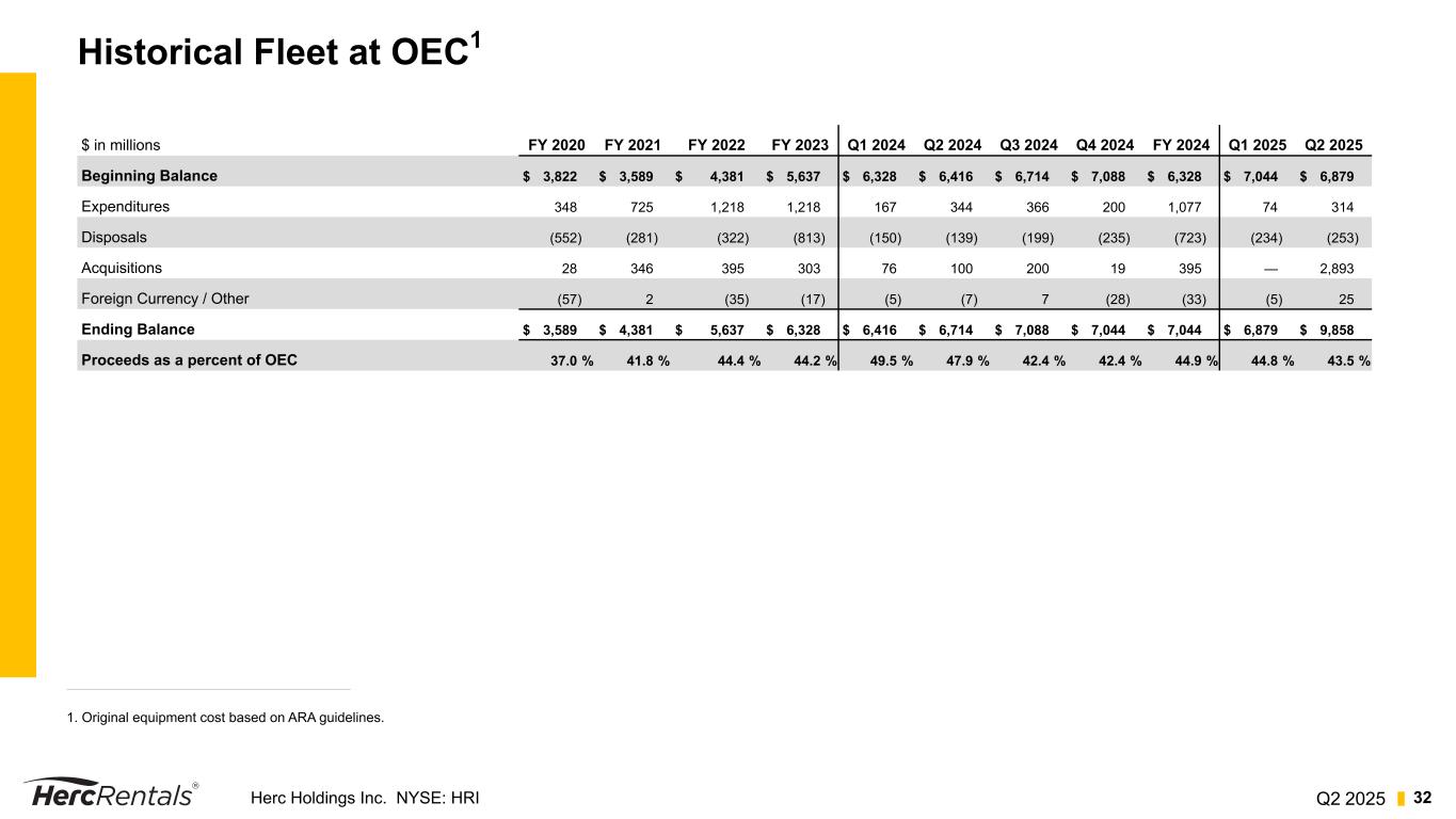 Q2 2025Herc Holdings Inc. NYSE: HRI 32 Historical Fleet at OEC1 $ in millions FY 2020 FY 2021 FY 2022 FY 2023 Q1 2024 Q2 2024 Q3 2024 Q4 2024 FY 2024 Q1 2025 Q2 2025 Beginning Balance $ 3,822 $ 3,589 $ 4,381 $ 5,637 $ 6,328 $ 6,416 $ 6,714 $ 7,088 $ 6,328 $ 7,044 $ 6,879 Expenditures 348 725 1,218 1,218 167 344 366 200 1,077 74 314 Disposals (552) (281) (322) (813) (150) (139) (199) (235) (723) (234) (253) Acquisitions 28 346 395 303 76 100 200 19 395 — 2,893 Foreign Currency / Other (57) 2 (35) (17) (5) (7) 7 (28) (33) (5) 25 Ending Balance $ 3,589 $ 4,381 $ 5,637 $ 6,328 $ 6,416 $ 6,714 $ 7,088 $ 7,044 $ 7,044 $ 6,879 $ 9,858 Proceeds as a percent of OEC 37.0 % 41.8 % 44.4 % 44.2 % 49.5 % 47.9 % 42.4 % 42.4 % 44.9 % 44.8 % 43.5 % 1. Original equipment cost based on ARA guidelines.