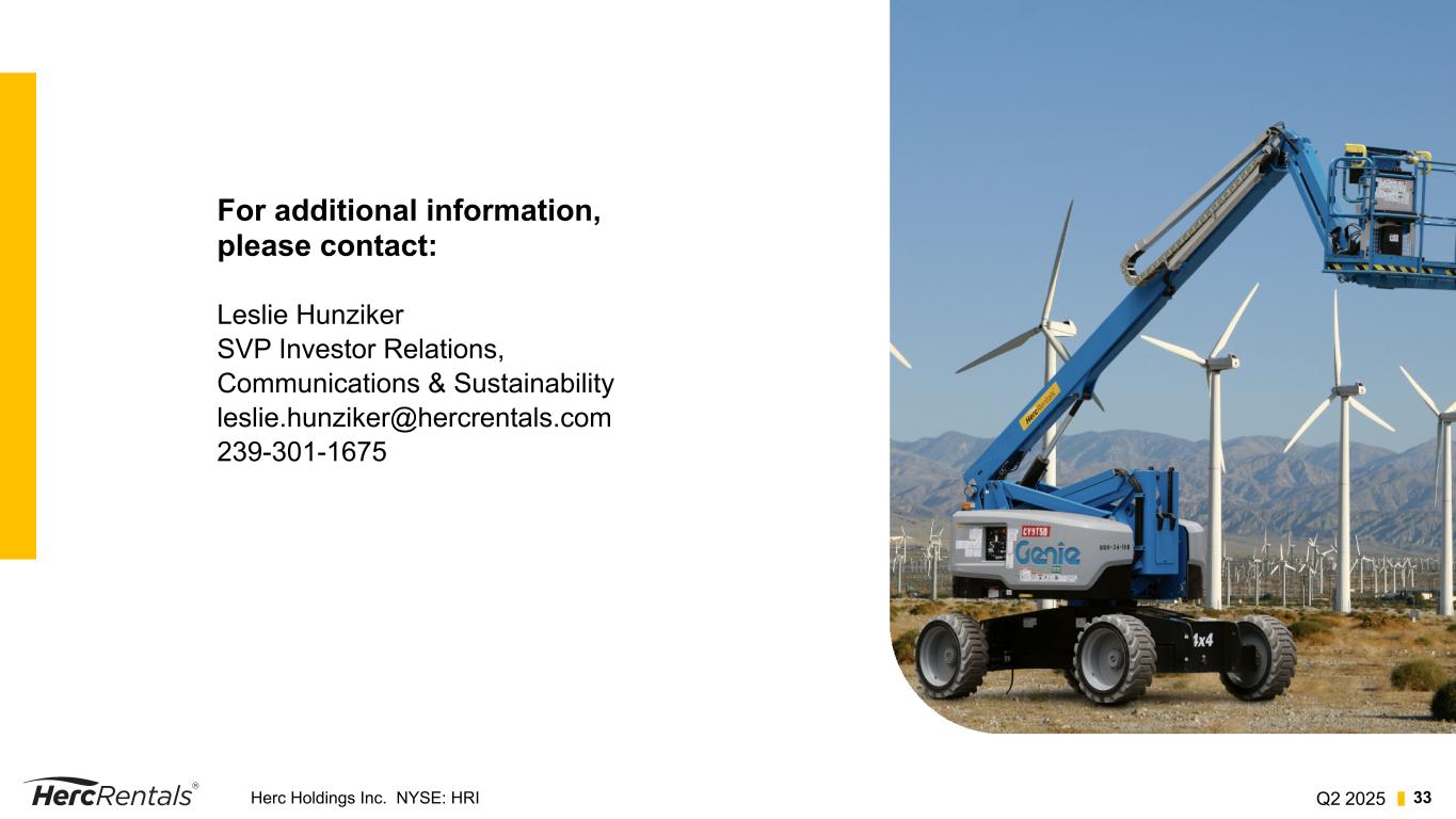Q2 2025Herc Holdings Inc. NYSE: HRI 33 For additional information, please contact: Leslie Hunziker SVP Investor Relations, Communications & Sustainability leslie.hunziker@hercrentals.com 239-301-1675