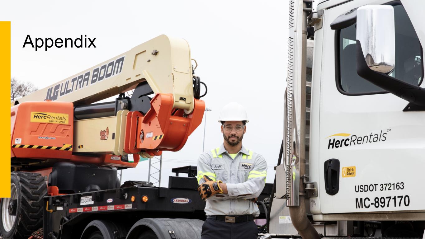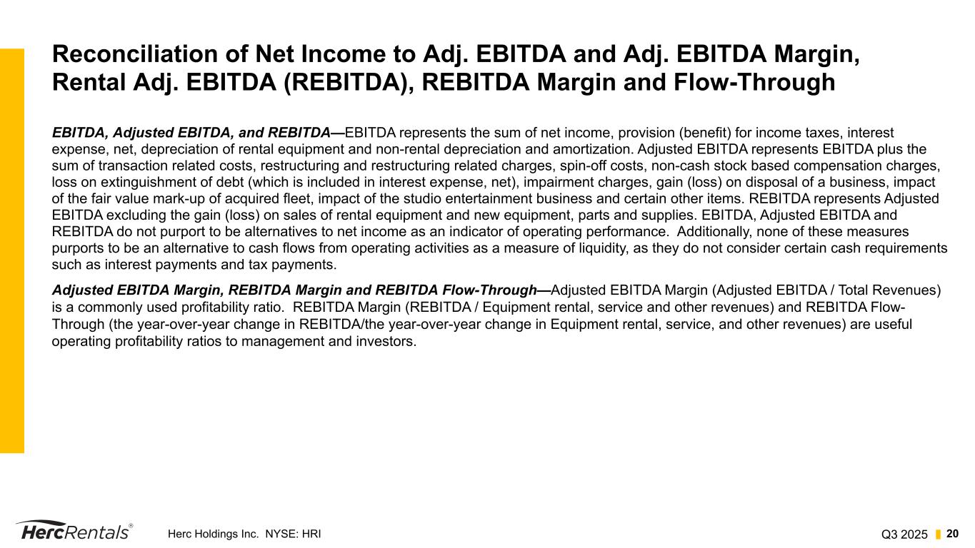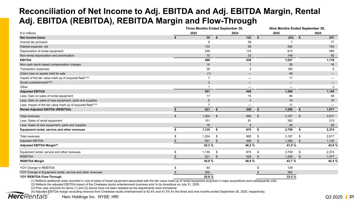 Q3 2025Herc Holdings Inc. NYSE: HRI 20 Reconciliation of Net Income to Adj. EBITDA and Adj. EBITDA Margin, Rental Adj. EBITDA (REBITDA), REBITDA Margin and Flow-Through EBITDA, Adjusted EBITDA, and REBITDA—EBITDA represents the sum of net income, provision (benefit) for income taxes, interest expense, net, depreciation of rental equipment and non-rental depreciation and amortization. Adjusted EBITDA represents EBITDA plus the sum of transaction related costs, restructuring and restructuring related charges, spin-off costs, non-cash stock based compensation charges, loss on extinguishment of debt (which is included in interest expense, net), impairment charges, gain (loss) on disposal of a business, impact of the fair value mark-up of acquired fleet, impact of the studio entertainment business and certain other items. REBITDA represents Adjusted EBITDA excluding the gain (loss) on sales of rental equipment and new equipment, parts and supplies. EBITDA, Adjusted EBITDA and REBITDA do not purport to be alternatives to net income as an indicator of operating performance. Additionally, none of these measures purports to be an alternative to cash flows from operating activities as a measure of liquidity, as they do not consider certain cash requirements such as interest payments and tax payments. Adjusted EBITDA Margin, REBITDA Margin and REBITDA Flow-Through—Adjusted EBITDA Margin (Adjusted EBITDA / Total Revenues) is a commonly used profitability ratio. REBITDA Margin (REBITDA / Equipment rental, service and other revenues) and REBITDA Flow- Through (the year-over-year change in REBITDA/the year-over-year change in Equipment rental, service, and other revenues) are useful operating profitability ratios to management and investors.