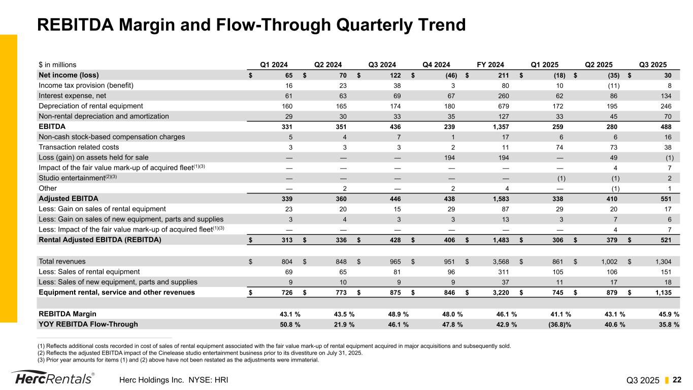 Q3 2025Herc Holdings Inc. NYSE: HRI 21 Reconciliation of Net Income to Adj. EBITDA and Adj. EBITDA Margin, Rental Adj. EBITDA (REBITDA), REBITDA Margin and Flow-Through Three Months Ended September 30, Nine Months Ended September 30, $ in millions 2025 2024 2025 2024 Net income (loss) $ 30 $ 122 $ (23) $ 257 Income tax provision 8 38 7 77 Interest expense, net 134 69 282 193 Depreciation of rental equipment 246 174 613 499 Non-rental depreciation and amortization 70 33 148 92 EBITDA 488 436 1,027 1,118 Non-cash stock-based compensation charges 16 7 28 16 Transaction expenses 38 3 185 9 (Gain) loss on assets held for sale (1) — 48 — Impact of the fair value mark-up of acquired fleet(1)(3) 7 — 11 — Studio entertainment(2)(3) 2 — — — Other 1 — — 2 Adjusted EBITDA 551 446 1,299 1,145 Less: Gain on sales of rental equipment 17 15 66 58 Less: Gain on sales of new equipment, parts and supplies 6 3 16 10 Less: Impact of the fair value mark-up of acquired fleet(1)(3) 7 — 11 — Rental Adjusted EBITDA (REBITDA) $ 521 $ 428 $ 1,206 $ 1,077 Total revenues $ 1,304 $ 965 $ 3,167 $ 2,617 Less: Sales of rental equipment 151 81 362 215 Less: Sales of new equipment, parts and supplies 18 9 46 28 Equipment rental, service and other revenues $ 1,135 $ 875 $ 2,759 $ 2,374 Total revenues $ 1,304 $ 965 $ 3,167 $ 2,617 Adjusted EBITDA $ 551 $ 446 $ 1,299 $ 1,145 Adjusted EBITDA Margin(4) 42.3 % 46.2 % 41.0 % 43.8 % Equipment rental, service and other revenues $ 1,135 $ 875 $ 2,759 $ 2,374 REBITDA $ 521 $ 428 $ 1,206 $ 1,077 REBITDA Margin 45.9 % 48.9 % 43.7 % 45.4 % YOY Change in REBITDA $ 93 $ 129 YOY Change in Equipment rental, service and other revenues $ 260 $ 385 YOY REBITDA Flow-Through 35.8 % 33.5 % (1) Reflects additional costs recorded in cost of sales of rental equipment associated with the fair value mark-up of rental equipment acquired in major acquisitions and subsequently sold. (2) Reflects the adjusted EBITDA impact of the Cinelease studio entertainment business prior to its divestiture on July 31, 2025. (3) Prior year amounts for items (1) and (2) above have not been restated as the adjustments were immaterial. (4) Adjusted EBITDA margin excluding revenue from Cinelease studio entertainment is 42.4% and 41.5% for the three and nine months ended September 30, 2025, respectively.