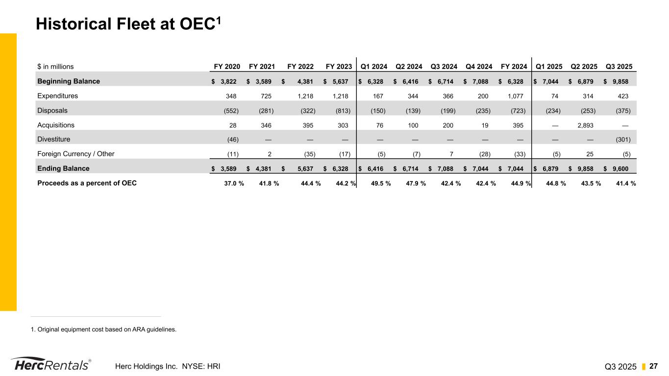 Q3 2025Herc Holdings Inc. NYSE: HRI 26 Reconciliation of Free Cash Flow Nine Months Ended September 30, Year Ended December 31, $ in millions 2025 2024 2024 2023 2022 Net cash provided by operating activities $ 770 $ 894 $ 1,225 $ 1,086 $ 917 Rental equipment expenditures (835) (753) (1,048) (1,320) (1,168) Proceeds from disposal of rental equipment 306 198 288 325 121 Net Fleet Capital Expenditures (529) (555) (760) (995) (1,047) Non-rental capital expenditures (123) (127) (161) (156) (104) Proceeds from disposal of property and equipment 15 6 10 15 7 Other — — — (15) (23) Free Cash Flow 133 218 314 (65) (250) Acquisitions, net of cash acquired (4,256) (567) (600) (430) (515) Proceeds from disposal of business, net 99 — — — — (Increase) decrease in Net Debt, excluding financing activities $ (4,024) $ (349) $ (286) $ (495) $ (765) Free Cash Flow $ 133 Cash paid for transaction related costs 209 Adjusted Free Cash Flow $ 342 Free cash flow is not a recognized term under GAAP and should not be considered in isolation or as a substitute for our reported results prepared in accordance with GAAP. Further, since all companies do not use identical calculations, our definition and presentation of this measure may not be comparable to similarly titled measures reported by other companies. Free Cash Flow and Adjusted Free Cash Flow—Free cash flow represents net cash provided by (used in) operating activities less rental equipment expenditures and non-rental capital expenditures, plus proceeds from disposal of rental equipment, proceeds from disposal of property and equipment, and other investing activities. Adjusted free cash flow removes the impact on operating activities of cash paid for transaction costs. Free cash flow and adjusted free cash flow are used by management in analyzing the Company’s ability to service and repay its debt, fund potential acquisitions and to forecast future periods. However, this measure does not represent funds available for investment or other discretionary uses since it does not deduct cash used to service debt or for other non-discretionary expenditures.