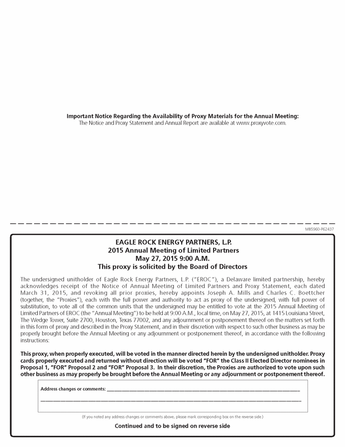 Important Notice Regarding the Availability of Proxy Materials for the Annual Meeting: The Notice and Proxy Statement and Annual Report are available at www.proxyvote.com. M85960-P62437 EAGLE ROCK ENERGY PARTNERS, L.P. 2015 Annual Meeting of Limited Partners May 27, 2015 9:00 A.M. This proxy is solicited by the Board of Directors The undersigned unitholder of Eagle Rock Energy Partners, L.P. (“EROC”), a Delaware limited partnership, hereby acknowledges receipt of the Notice of Annual Meeting of Limited Partners and Proxy Statement, each dated March 31, 2015, and revoking all prior proxies, hereby appoints Joseph A. Mills and Charles C. Boettcher (together, the “Proxies”), each with the full power and authority to act as proxy of the undersigned, with full power of substitution, to vote all of the common units that the undersigned may be entitled to vote at the 2015 Annual Meeting of Limited Partners of EROC (the “Annual Meeting”) to be held at 9:00 A.M., local time, on May 27, 2015, at 1415 Louisiana Street, The Wedge Tower, Suite 2700, Houston, Texas 77002, and any adjournment or postponement thereof on the matters set forth in this form of proxy and described in the Proxy Statement, and in their discretion with respect to such other business as may be properly brought before the Annual Meeting or any adjournment or postponement thereof, in accordance with the following instructions: This proxy, when properly executed, will be voted in the manner directed herein by the undersigned unitholder. Proxy cards properly executed and returned without direction will be voted “FOR” the Class II Elected Director nominees in Proposal 1, “FOR” Proposal 2 and “FOR” Proposal 3. In their discretion, the Proxies are authorized to vote upon such other business as may properly be brought before the Annual Meeting or any adjournment or postponement thereof. Address changes or comments: _____________________________________________________________________________ ________________________________________________________________________________________________________ (If you noted any address changes or comments above, please mark corresponding box on the reverse side.) Continued and to be signed on reverse side |