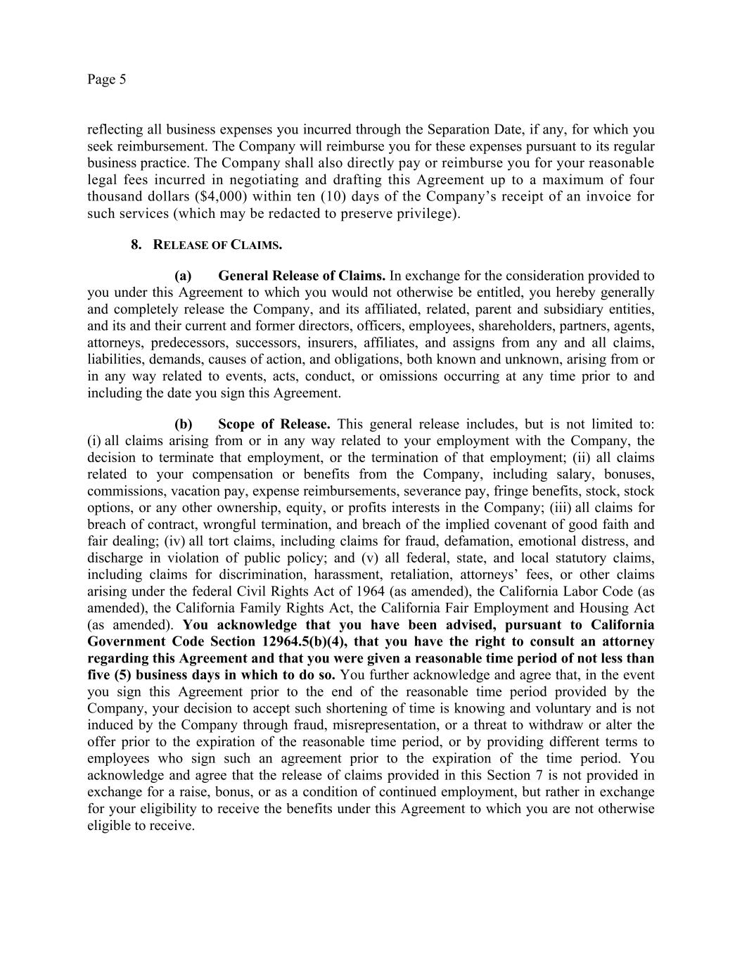 Page 5 reflecting all business expenses you incurred through the Separation Date, if any, for which you seek reimbursement. The Company will reimburse you for these expenses pursuant to its regular business practice. The Company shall also directly pay or reimburse you for your reasonable legal fees incurred in negotiating and drafting this Agreement up to a maximum of four thousand dollars ($4,000) within ten (10) days of the Company’s receipt of an invoice for such services (which may be redacted to preserve privilege). 8. RELEASE OF CLAIMS. (a) General Release of Claims. In exchange for the consideration provided to you under this Agreement to which you would not otherwise be entitled, you hereby generally and completely release the Company, and its affiliated, related, parent and subsidiary entities, and its and their current and former directors, officers, employees, shareholders, partners, agents, attorneys, predecessors, successors, insurers, affiliates, and assigns from any and all claims, liabilities, demands, causes of action, and obligations, both known and unknown, arising from or in any way related to events, acts, conduct, or omissions occurring at any time prior to and including the date you sign this Agreement. (b) Scope of Release. This general release includes, but is not limited to: (i) all claims arising from or in any way related to your employment with the Company, the decision to terminate that employment, or the termination of that employment; (ii) all claims related to your compensation or benefits from the Company, including salary, bonuses, commissions, vacation pay, expense reimbursements, severance pay, fringe benefits, stock, stock options, or any other ownership, equity, or profits interests in the Company; (iii) all claims for breach of contract, wrongful termination, and breach of the implied covenant of good faith and fair dealing; (iv) all tort claims, including claims for fraud, defamation, emotional distress, and discharge in violation of public policy; and (v) all federal, state, and local statutory claims, including claims for discrimination, harassment, retaliation, attorneys’ fees, or other claims arising under the federal Civil Rights Act of 1964 (as amended), the California Labor Code (as amended), the California Family Rights Act, the California Fair Employment and Housing Act (as amended). You acknowledge that you have been advised, pursuant to California Government Code Section 12964.5(b)(4), that you have the right to consult an attorney regarding this Agreement and that you were given a reasonable time period of not less than five (5) business days in which to do so. You further acknowledge and agree that, in the event you sign this Agreement prior to the end of the reasonable time period provided by the Company, your decision to accept such shortening of time is knowing and voluntary and is not induced by the Company through fraud, misrepresentation, or a threat to withdraw or alter the offer prior to the expiration of the reasonable time period, or by providing different terms to employees who sign such an agreement prior to the expiration of the time period. You acknowledge and agree that the release of claims provided in this Section 7 is not provided in exchange for a raise, bonus, or as a condition of continued employment, but rather in exchange for your eligibility to receive the benefits under this Agreement to which you are not otherwise eligible to receive.