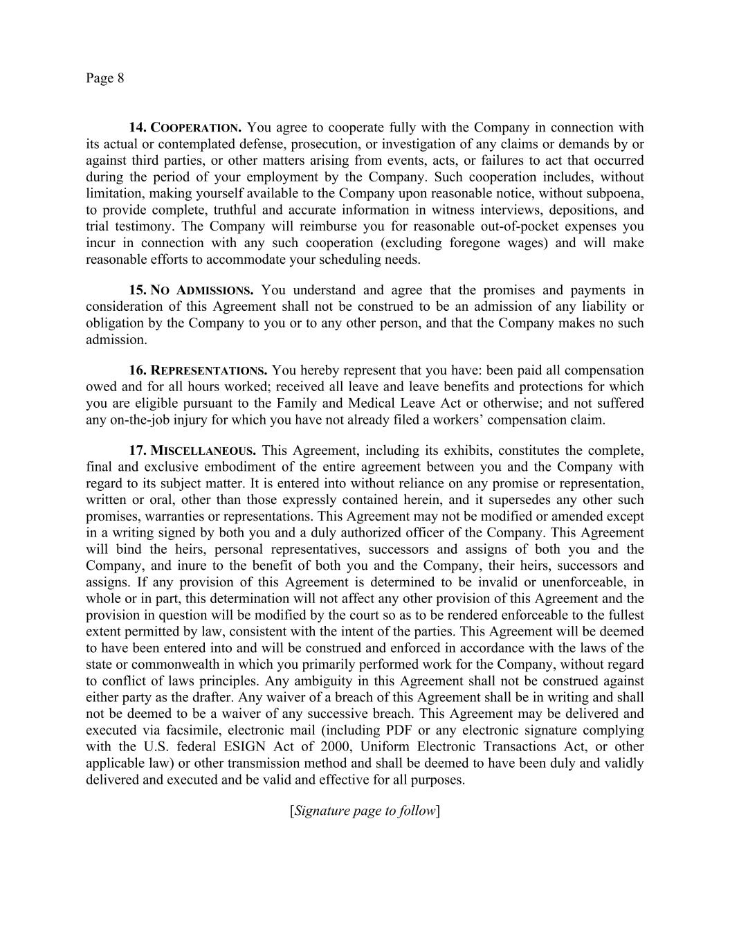 Page 8 14. COOPERATION. You agree to cooperate fully with the Company in connection with its actual or contemplated defense, prosecution, or investigation of any claims or demands by or against third parties, or other matters arising from events, acts, or failures to act that occurred during the period of your employment by the Company. Such cooperation includes, without limitation, making yourself available to the Company upon reasonable notice, without subpoena, to provide complete, truthful and accurate information in witness interviews, depositions, and trial testimony. The Company will reimburse you for reasonable out-of-pocket expenses you incur in connection with any such cooperation (excluding foregone wages) and will make reasonable efforts to accommodate your scheduling needs. 15. NO ADMISSIONS. You understand and agree that the promises and payments in consideration of this Agreement shall not be construed to be an admission of any liability or obligation by the Company to you or to any other person, and that the Company makes no such admission. 16. REPRESENTATIONS. You hereby represent that you have: been paid all compensation owed and for all hours worked; received all leave and leave benefits and protections for which you are eligible pursuant to the Family and Medical Leave Act or otherwise; and not suffered any on-the-job injury for which you have not already filed a workers’ compensation claim. 17. MISCELLANEOUS. This Agreement, including its exhibits, constitutes the complete, final and exclusive embodiment of the entire agreement between you and the Company with regard to its subject matter. It is entered into without reliance on any promise or representation, written or oral, other than those expressly contained herein, and it supersedes any other such promises, warranties or representations. This Agreement may not be modified or amended except in a writing signed by both you and a duly authorized officer of the Company. This Agreement will bind the heirs, personal representatives, successors and assigns of both you and the Company, and inure to the benefit of both you and the Company, their heirs, successors and assigns. If any provision of this Agreement is determined to be invalid or unenforceable, in whole or in part, this determination will not affect any other provision of this Agreement and the provision in question will be modified by the court so as to be rendered enforceable to the fullest extent permitted by law, consistent with the intent of the parties. This Agreement will be deemed to have been entered into and will be construed and enforced in accordance with the laws of the state or commonwealth in which you primarily performed work for the Company, without regard to conflict of laws principles. Any ambiguity in this Agreement shall not be construed against either party as the drafter. Any waiver of a breach of this Agreement shall be in writing and shall not be deemed to be a waiver of any successive breach. This Agreement may be delivered and executed via facsimile, electronic mail (including PDF or any electronic signature complying with the U.S. federal ESIGN Act of 2000, Uniform Electronic Transactions Act, or other applicable law) or other transmission method and shall be deemed to have been duly and validly delivered and executed and be valid and effective for all purposes. [Signature page to follow]