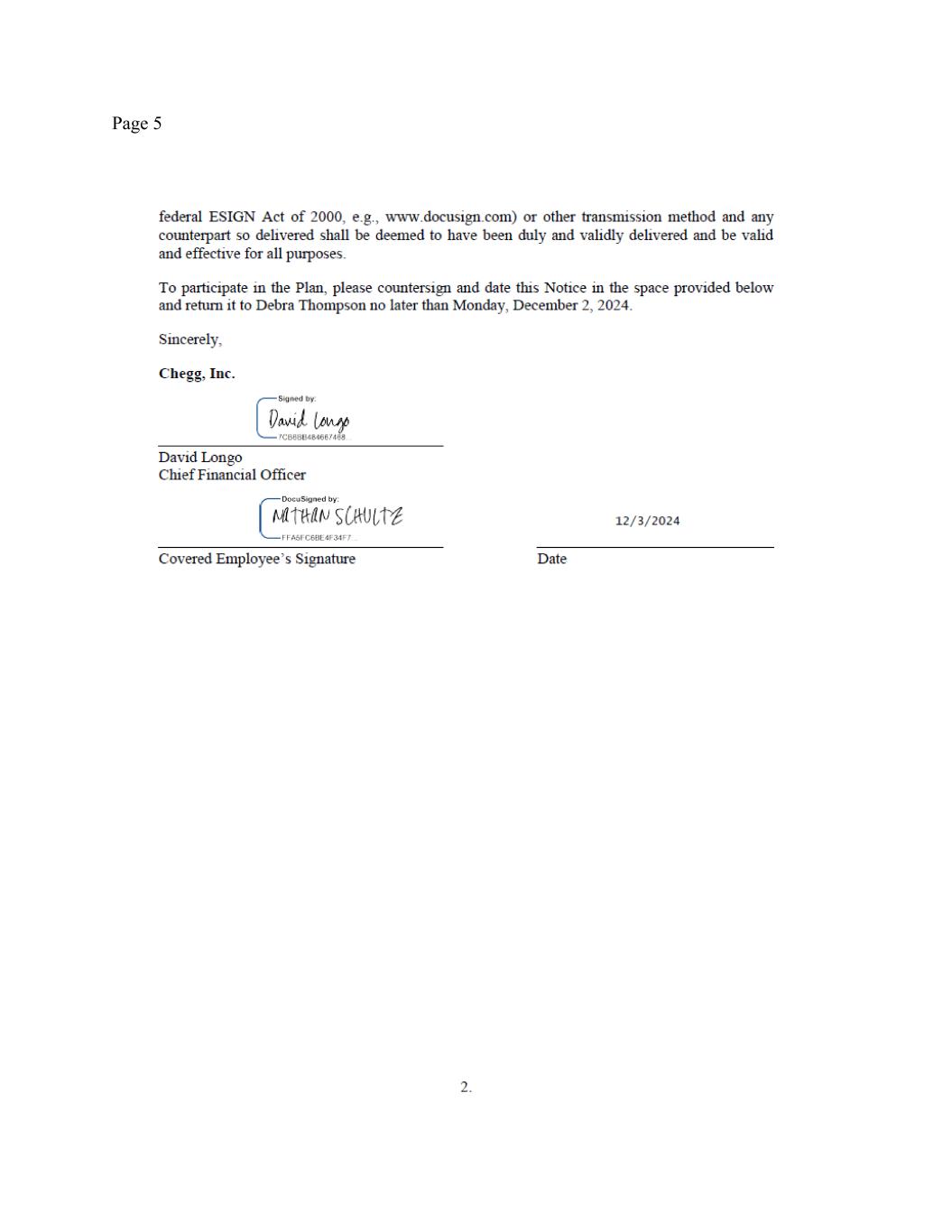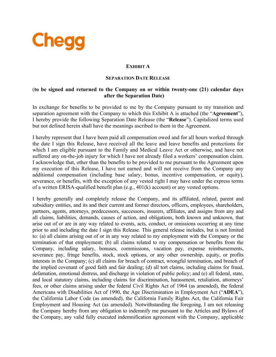 Page 2 withholdings. In addition, your outstanding Company equity awards will continue to vest under the existing terms and conditions set forth in the governing plan documents and award agreement. You will continue to be eligible for the Company’s standard benefits, subject to the terms and conditions applicable to such plans and programs. For clarity, you shall not be eligible for payment of any bonuses for 2025 (except as set forth in Section 4 herein). (c) Messaging. All public or internal statements concerning your departure shall be consistent with the Chegg Project Civic Assets communications plan. Nothing in this Agreement shall prevent the Company from making any disclosures that it determines, in consultation with counsel, are required by applicable law, regulation, or stock-exchange rule. (d) Termination. Nothing in this Agreement alters your employment at will status. Accordingly, during the Transition Period you are entitled to resign your employment for any reason with or without advance notice, and the Company may terminate your employment with or without Cause (as defined in the Severance Plan, defined below) or advance notice. If prior to December 31, 2025 the Company terminates your employment without Cause, then you will remain eligible for the Severance Benefits (as defined and described below), provided that you have satisfied the Severance Preconditions (as set forth below). If prior to December 31, 2025, you resign your employment for any reason or the Company terminates your employment with Cause, then you will no longer be eligible for participation in any Company benefit plans, and you will not be entitled to the Severance Benefits. 3. FINAL PAY. On the Separation Date, the Company will pay you all accrued salary earned through the Separation Date, subject to standard payroll deductions and withholdings. You are entitled to this payment regardless of whether or not you sign this Agreement. Since the Company has a nonaccrual vacation policy, you do not have any accrued vacation or other paid time off and thus will not be paid out for any accrued vacation or other paid time off. 4. SEVERANCE BENEFITS. If you: (i) timely sign this Agreement; (ii) comply with your obligations under it; (iii) have not resigned your employment and your employment has not been terminated by the Company for Cause; and (iv) timely sign, return, and allow to become effective the Separation Date Release attached as Exhibit A hereto ((i)-(iv) collectively, the “Severance Preconditions”), then your employment termination will be deemed a termination “other than for Cause” “on or before the second anniversary of the Effective Date and other than during the Change in Control Determination Period,” pursuant to that certain Participation Agreement entered into pursuant to the Company’s Severance Plan, signed by you on December 3, 2024 (such Participation Agreement and plan being referred to collectively herein as the “Severance Plan”), a copy of which is attached as Exhibit B hereto, and accordingly, pursuant to Section 4.3 of the Severance Plan the Company will provide you with the following severance benefits (the “Severance Benefits”). Capitalized terms not defined in this Agreement shall have the meaning set forth in the Severance Plan. (a) Severance Pay. The Company will pay you, as severance, the equivalent of 125% of your annual base salary in effect as of the Separation Date, in the total amount of $1,250,000) (calculated as 1.25 x $1,000,000), subject to applicable payroll deductions and