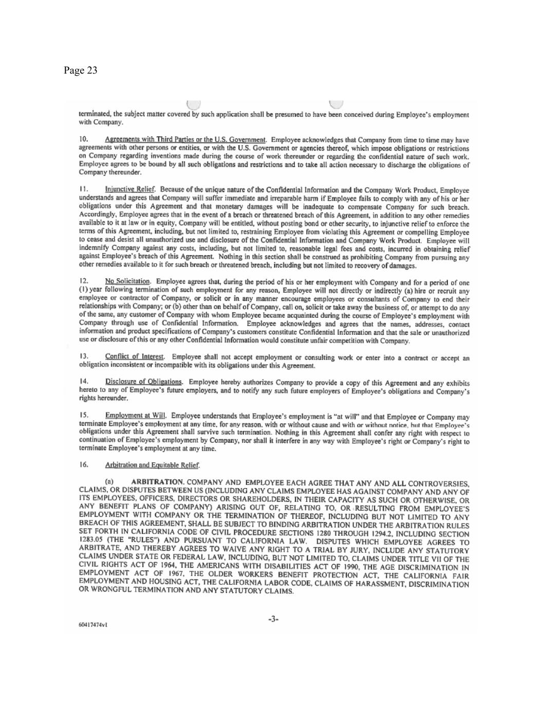 Page 7 of any kind which contain or embody any proprietary or confidential information of the Company (and all reproductions or embodiments thereof in whole or in part). You agree that you will make a diligent search to locate any such documents, property and information by the close of business on the Separation Date or as soon as possible thereafter. If you have used any personally owned computer or other electronic device, server, or e-mail system to receive, store, review, prepare or transmit any Company confidential or proprietary data, materials or information, by the Separation Date (or earlier if requested by the Company), you shall provide the Company with a computer-useable copy of such information and then permanently delete and expunge such Company confidential or proprietary information from those systems; and you agree to provide the Company access to your system as requested to verify that the necessary copying and/or deletion is completed. 11. CONFIDENTIAL INFORMATION OBLIGATIONS. You acknowledge and reaffirm your continuing obligations under your Employee Confidentiality and Inventions Agreement (the “Confidentiality Agreement”), a copy of which is attached hereto as Exhibit C and incorporated herein by reference. The Company acknowledges that each of the post-term obligations in Section 12(b) of the Confidentiality Agreement is void and that it shall take no steps to enforce those provisions. 12. MUTUAL NON-DISPARAGEMENT. Except to the extent permitted by the “Protected Rights” Section above, you agree not to disparage the Company, its officers, directors, employees, shareholders, parents, subsidiaries, affiliates, and agents, in any manner likely to be harmful to its or their business, business reputation, or personal reputation, and the Company agrees not to disparage you in any manner likely to be harmful to your business or personal reputation; however, the Company’s obligations under this provision extend only to its current directors, officers, and executives (at the Vice President-level and above), and only for so long as each remains a director, officer, or executive of the Company. Notwithstanding the foregoing, nothing herein shall prevent (a) any person or entity from responding accurately and fully to any question, inquiry or request for information when required by legal process or in connection with any government agency or commission investigation or proceeding, (b) the Company from making any disclosures reasonably required or advisable to fulfill any corporate reporting obligations or its fiduciary duties, and (c) any person from making any statements and disclosures specifically authorized in the “Protected Rights” Section above. You acknowledge and agree that the non-disparagement obligation provided in this Section is not provided in exchange for a raise, bonus, or as a condition of continued employment, but rather in exchange for your eligibility to receive the benefits under this Agreement to which you are not otherwise eligible to receive. 13. NO VOLUNTARY ADVERSE ACTION. You agree that you will not voluntarily (except in response to legal compulsion or as permitted under the section of this Agreement entitled “Protected Rights”) assist any person in bringing or pursuing any proposed or pending litigation, arbitration, administrative claim or other formal proceeding against the Company, its parent or subsidiary entities, affiliates, officers, directors, employees or agents.