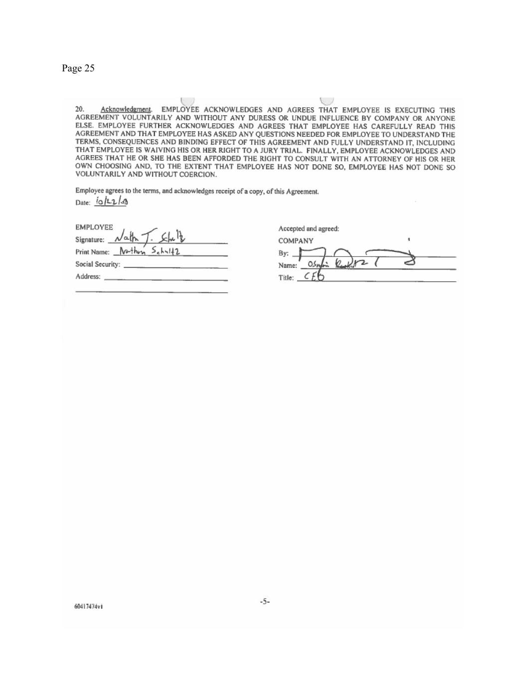 Page 3 agree that, to maximum extent permitted by law, I am otherwise waiving any and all rights I may have to individual relief based on any claims that I have released and any rights I have waived by signing this Release. Nothing in this Release waives any rights I may have under Section 7 of the National Labor Relations Act (subject to the release of claims set forth herein). This Separation Date Release, together with the Agreement (and its exhibits), constitutes the entire agreement between me, and the Company with respect to the subject matter hereof. I am not relying on any representation not contained herein or in the Agreement. UNDERSTOOD, ACCEPTED AND AGREED: _____________________________________ ______________________ Nathan Schultz Date