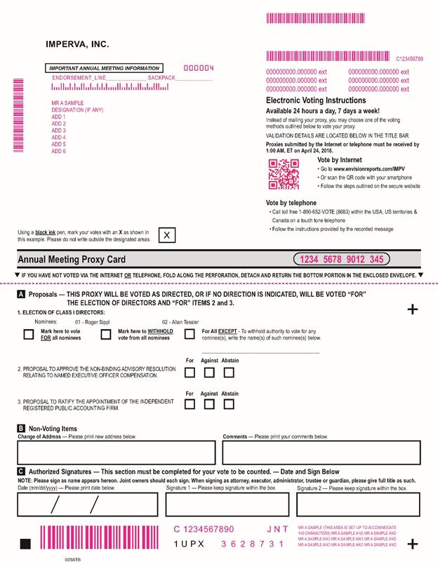 . MMMMMMMMMMMM IMPERVA, INC. IMPORTANT ANNUAL MEETING INFORMATION 000004 MMMMMMMMMMMMMMM 000000000.000000 ext 000000000.000000 ext C123456789 MMMMMMMMMENDORSEMENT_LINE______________ SACKPACK_____________ MR A SAMPLE DESIGNATION (IF ANY) ADD 1 ADD 2 ADD 3 ADD 4 ADD 5 ADD 6 Using a black ink pen, mark your votes with an X as shown in this example. Please do not write outside the designated areas. X 000000000.000000 ext 000000000.000000 ext 000000000.000000 ext 000000000.000000 ext Electronic Voting Instructions Available 24 hours a day, 7 days a week! Instead of mailing your proxy, you may choose one of the voting methods outlined below to vote your proxy. VALIDATION DETAILS ARE LOCATED BELOW IN THE TITLE BAR. Proxies submitted by the Internet or telephone must be received by1:00 AM, ET on April 24, 2018. Vote by Internet • Go to www.envisionreports.com/IMPV • Or scan the QR code with your smartphone • Follow the steps outlined on the secure website Vote by telephone • Call toll free 1-800-652-VOTE (8683) within the USA, US territories & Canada on a touch tone telephone • Follow the instructions provided by the recorded message Annual Meeting Proxy Card 1234 5678 9012 345 • IF YOU HAVE NOT VOTED VIA THE INTERNET OR TELEPHONE, FOLD ALONG THE PERFORATION, DETACH AND RETURN THE BOTTOM PORTION IN THE ENCLOSED ENVELOPE. • A Proposals — THIS PROXY WILL BE VOTED AS DIRECTED, OR IF NO DIRECTION IS INDICATED, WILL BE VOTED “FOR” THE ELECTION OF DIRECTORS AND “FOR” ITEMS 2 and 3. Mark here to vote FOR all nominees 01 - Roger Sippl 1. ELECTION OF CLASS I DIRECTORS: Nominees: Mark here to WITHHOLD vote from all nominees 02 - Allan Tessler For All EXCEPT - To withhold authority to vote for any nominee(s), write the name(s) of such nominee(s) below. + For Against Abstain _____________________________________________ 2. PROPOSAL TO APPROVE THE NON-BINDING ADVISORY RESOLUTION RELATING TO NAMED EXECUTIVE OFFICER COMPENSATION. For Against Abstain 3. PROPOSAL TO RATIFY THE APPOINTMENT OF THE INDEPENDENT REGISTERED PUBLIC ACCOUNTING FIRM. B Non-Voting Items Change of Address — Please print new address below. Comments — Please print your comments below. C Authorized Signatures — This section must be completed for your vote to be counted. — Date and Sign Below NOTE: Please sign as name appears hereon. Joint owners should each sign. When signing as attorney, executor, administrator, trustee or guardian, please give full title as such. Date (mm/dd/yyyy) — Please print date below. Signature 1 — Please keep signature within the box. Signature 2 — Please keep signature within the box. MR A SAMPLE (THIS AREA IS SET UP TO ACCOMMODATE C 1234567890 J N T 140 CHARACTERS) MR A SAMPLE AND MR A SAMPLE AND MR A SAMPLE AND MR A SAMPLE AND MR A SAMPLE AND 1UP X 3628731 MR A SAMPLE AND MR A SAMPLE AND MR A SAMPLE AND MMMMMMM + 02S6TB