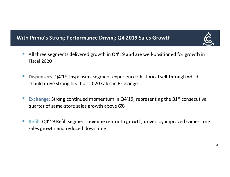 Primo is the U.S. Market Leader in Three Water Categories Innovative Dispensers dispenser ~8,700 Dispenser Sell Through products at (2) 13% CAGR since 2013 locations $59mm attractive retail 8% Gross Margin prices Exchange Prefilled, 31 consecutive quarters of ~13,800 branded purified samestore sales growth water delivered locations $83mm above 6% directly to stores 30% Gross Margin Refill Sustainable ~23,100 filtered water Significant location growth vended onsite at opportunity (1) locations $162mm retail locations 31% Gross Margin Source: Company filings, Primo management. Note: Represents LTM revenue and LTM gross margin metrics. LTM period as of September 30, 2019. (1) Revenue and gross margin are pro forma for sale of Glacier Ice business. 10 (2) Represents CAGR from Q3 2013 to Q3 2019.Primo is the U.S. Market Leader in Three Water Categories Innovative Dispensers dispenser ~8,700 Dispenser Sell Through products at (2) 13% CAGR since 2013 locations $59mm attractive retail 8% Gross Margin prices Exchange Prefilled, 31 consecutive quarters of ~13,800 branded purified samestore sales growth water delivered locations $83mm above 6% directly to stores 30% Gross Margin Refill Sustainable ~23,100 filtered water Significant location growth vended onsite at opportunity (1) locations $162mm retail locations 31% Gross Margin Source: Company filings, Primo management. Note: Represents LTM revenue and LTM gross margin metrics. LTM period as of September 30, 2019. (1) Revenue and gross margin are pro forma for sale of Glacier Ice business. 10 (2) Represents CAGR from Q3 2013 to Q3 2019.