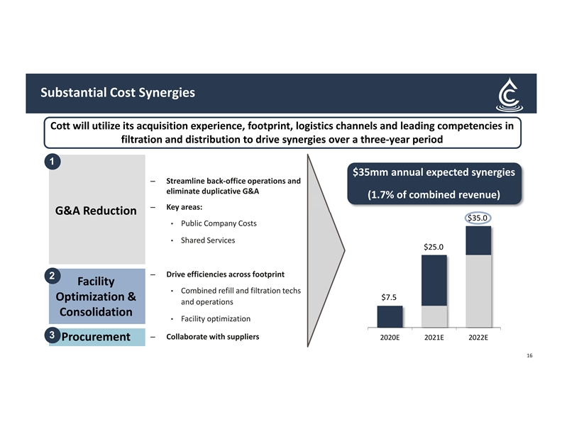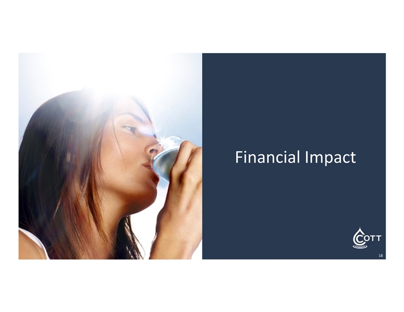 Substantial Cost Synergies Cott will utilize its acquisition experience, footprint, logistics channels and leading competencies in filtration and distribution to drive synergies over a threeyear period 1 $35mm annual expected synergies Streamline backoffice operations and eliminate duplicative G&A (1.7% of combined revenue) Key areas: G&A Reduction $35.0 • Public Company Costs • Shared Services $25.0 Drive efficiencies across footprint 2 Facility • Combined refill and filtration techs $7.5 Optimization & and operations Consolidation • Facility optimization 3 Collaborate with suppliers 2020E 2021E 2022E Procurement 16Substantial Cost Synergies Cott will utilize its acquisition experience, footprint, logistics channels and leading competencies in filtration and distribution to drive synergies over a threeyear period 1 $35mm annual expected synergies Streamline backoffice operations and eliminate duplicative G&A (1.7% of combined revenue) Key areas: G&A Reduction $35.0 • Public Company Costs • Shared Services $25.0 Drive efficiencies across footprint 2 Facility • Combined refill and filtration techs $7.5 Optimization & and operations Consolidation • Facility optimization 3 Collaborate with suppliers 2020E 2021E 2022E Procurement 16