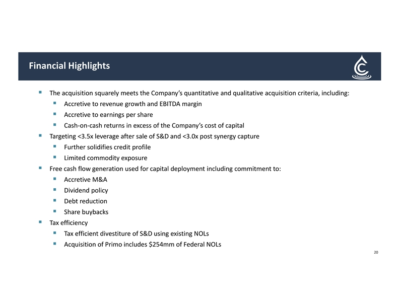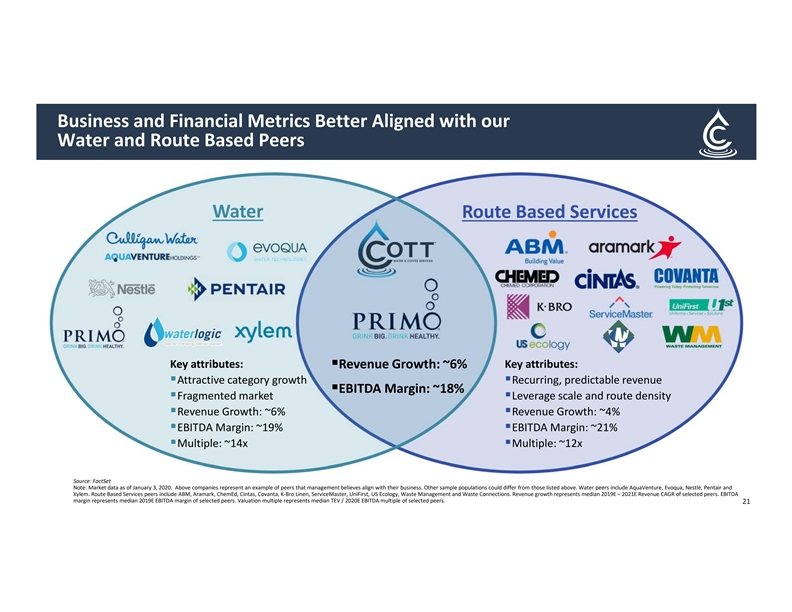 Strong Pro Forma Financial Profile + – = LTM Q3’19 (3) $2.4 $0.3 $0.6 $2.0 Revenue ($bn) (1) (2) Revenue Growth ~4% ~7% Flat ~6% LTM Q3’19 (4) $313 $50 $40 $359 Adj. EBITDA ($mm) $35mm synergies Adj. EBITDA (4) 13% 17% 7% 18% margin Source: Company filings, Cott and Primo management. Note: Revenue growth represents 20172019E CAGR. EBITDA margin represents LTM Adj. EBITDA margin. LTM period as of September 30, 2019. (1) Pro forma for sale of RCI/Concentrate business as well as the legacy Cott Beverages business sold in January 2019 and January 2018, respectively. (2) Adjusted to exclude the sale of Glacier Ice business. (3) Elimination of $50mm pro forma intercompany revenue. (4) Includes $35mm runrate synergies. 19Strong Pro Forma Financial Profile + – = LTM Q3’19 (3) $2.4 $0.3 $0.6 $2.0 Revenue ($bn) (1) (2) Revenue Growth ~4% ~7% Flat ~6% LTM Q3’19 (4) $313 $50 $40 $359 Adj. EBITDA ($mm) $35mm synergies Adj. EBITDA (4) 13% 17% 7% 18% margin Source: Company filings, Cott and Primo management. Note: Revenue growth represents 20172019E CAGR. EBITDA margin represents LTM Adj. EBITDA margin. LTM period as of September 30, 2019. (1) Pro forma for sale of RCI/Concentrate business as well as the legacy Cott Beverages business sold in January 2019 and January 2018, respectively. (2) Adjusted to exclude the sale of Glacier Ice business. (3) Elimination of $50mm pro forma intercompany revenue. (4) Includes $35mm runrate synergies. 19