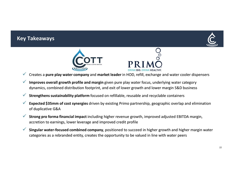 Key Takeaways Creates a pure play water company and market leader in HOD, refill, exchange and water cooler dispensers Improves overall growth profile and margin given pure play water focus, underlying water category dynamics, combined distribution footprint, and exit of lower growth and lower margin S&D business Strengthens sustainability platform focused on refillable, reusable and recyclable containers Expected $35mm of cost synergies driven by existing Primo partnership, geographic overlap and elimination of duplicative G&A Strong pro forma financial impact including higher revenue growth, improved adjusted EBITDA margin, accretion to earnings, lower leverage and improved credit profile Singular water-focused combined company, positioned to succeed in higher growth and higher margin water categories as a rebranded entity, creates the opportunity to be valued in line with water peers 22Key Takeaways Creates a pure play water company and market leader in HOD, refill, exchange and water cooler dispensers Improves overall growth profile and margin given pure play water focus, underlying water category dynamics, combined distribution footprint, and exit of lower growth and lower margin S&D business Strengthens sustainability platform focused on refillable, reusable and recyclable containers Expected $35mm of cost synergies driven by existing Primo partnership, geographic overlap and elimination of duplicative G&A Strong pro forma financial impact including higher revenue growth, improved adjusted EBITDA margin, accretion to earnings, lower leverage and improved credit profile Singular water-focused combined company, positioned to succeed in higher growth and higher margin water categories as a rebranded entity, creates the opportunity to be valued in line with water peers 22
