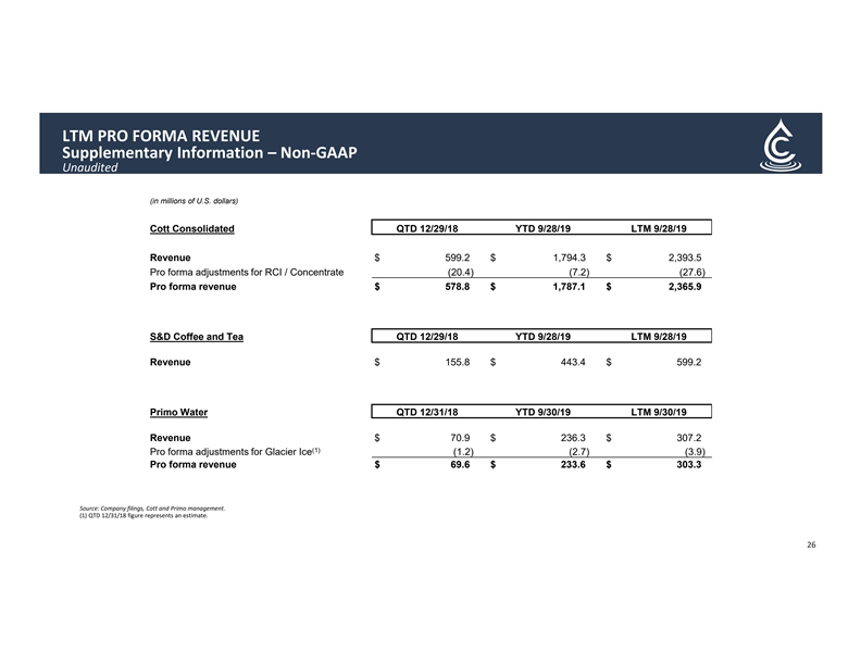 LTM PRO FORMA REVENUE Supplementary Information – Non-GAAP Unaudited (in millions of U.S. dollars) Cott Consolidated QTD 12/29/18 YTD 9/28/19 LTM 9/28/19 Revenue $ 599.2 $ 1,794.3 $ 2,393.5 Pro forma adjustments for RCI / Concentrate (20.4) (7.2) (27.6) Pro forma revenue $ 578.8 $ 1,787.1 $ 2,365.9 S&D Coffee and Tea QTD 12/29/18 YTD 9/28/19 LTM 9/28/19 Revenue $ 155.8 $ 443.4 $ 599.2 Primo Water QTD 12/31/18 YTD 9/30/19 LTM 9/30/19 Revenue $ 70.9 $ 236.3 $ 307.2 (1) Pro forma adjustments for Glacier Ice (1.2) (2.7) (3.9) Pro forma revenue $ 69.6 $ 233.6 $ 303.3 Source: Company filings, Cott and Primo management. (1) QTD 12/31/18 figure represents an estimate. 26LTM PRO FORMA REVENUE Supplementary Information – Non-GAAP Unaudited (in millions of U.S. dollars) Cott Consolidated QTD 12/29/18 YTD 9/28/19 LTM 9/28/19 Revenue $ 599.2 $ 1,794.3 $ 2,393.5 Pro forma adjustments for RCI / Concentrate (20.4) (7.2) (27.6) Pro forma revenue $ 578.8 $ 1,787.1 $ 2,365.9 S&D Coffee and Tea QTD 12/29/18 YTD 9/28/19 LTM 9/28/19 Revenue $ 155.8 $ 443.4 $ 599.2 Primo Water QTD 12/31/18 YTD 9/30/19 LTM 9/30/19 Revenue $ 70.9 $ 236.3 $ 307.2 (1) Pro forma adjustments for Glacier Ice (1.2) (2.7) (3.9) Pro forma revenue $ 69.6 $ 233.6 $ 303.3 Source: Company filings, Cott and Primo management. (1) QTD 12/31/18 figure represents an estimate. 26