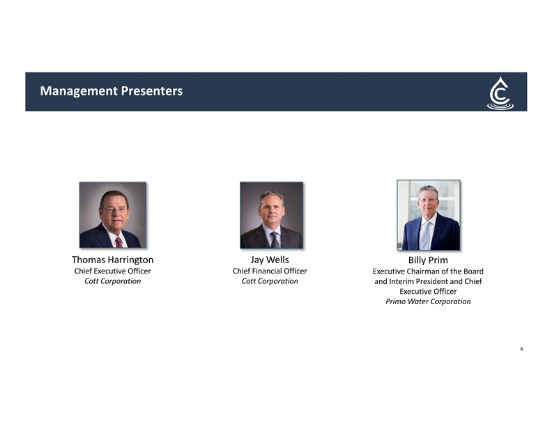 Management Presenters Thomas Harrington Jay Wells Billy Prim Chief Executive Officer Chief Financial Officer Executive Chairman of the Board Cott Corporation Cott Corporation and Interim President and Chief Executive Officer Primo Water Corporation 4Management Presenters Thomas Harrington Jay Wells Billy Prim Chief Executive Officer Chief Financial Officer Executive Chairman of the Board Cott Corporation Cott Corporation and Interim President and Chief Executive Officer Primo Water Corporation 4